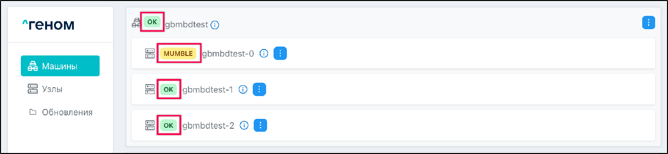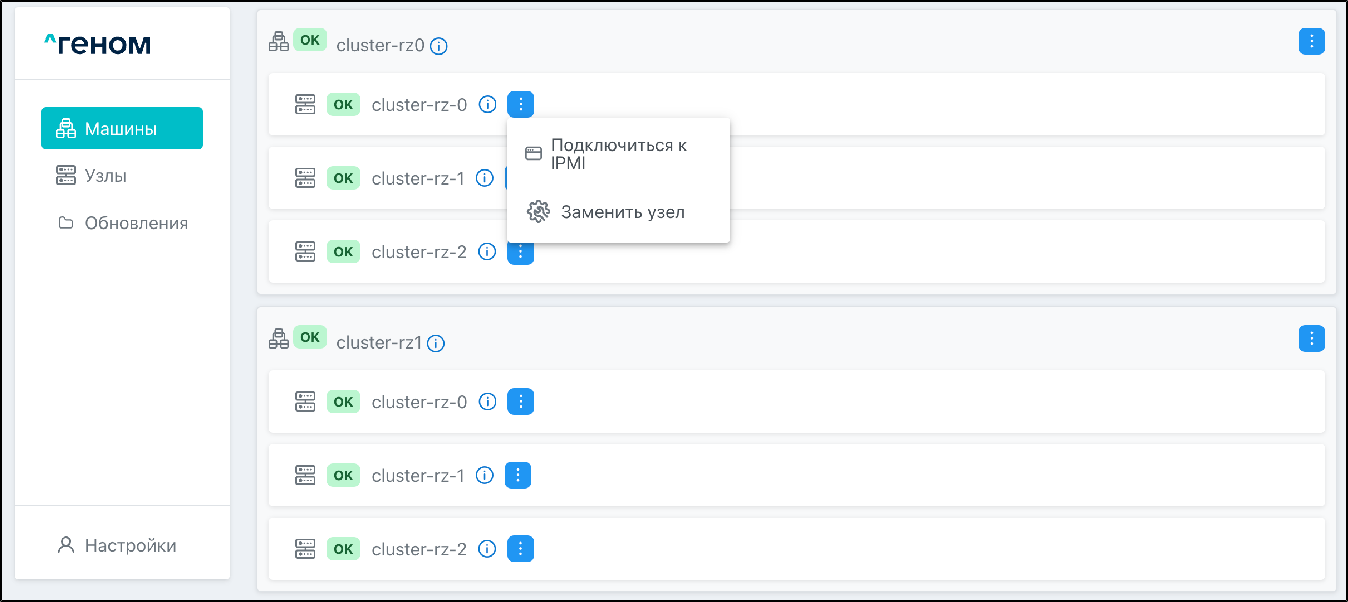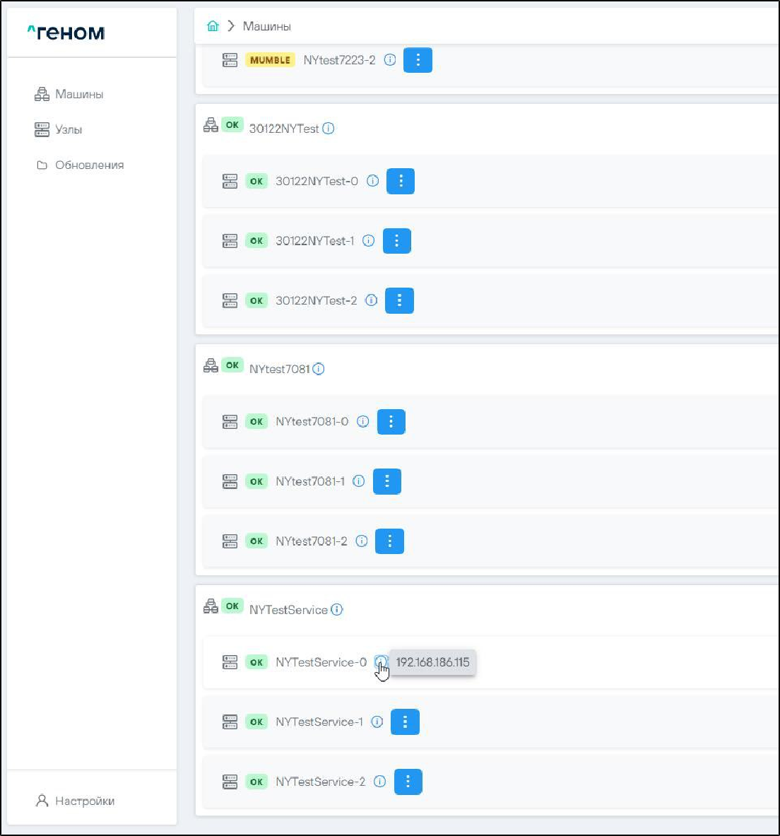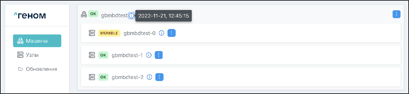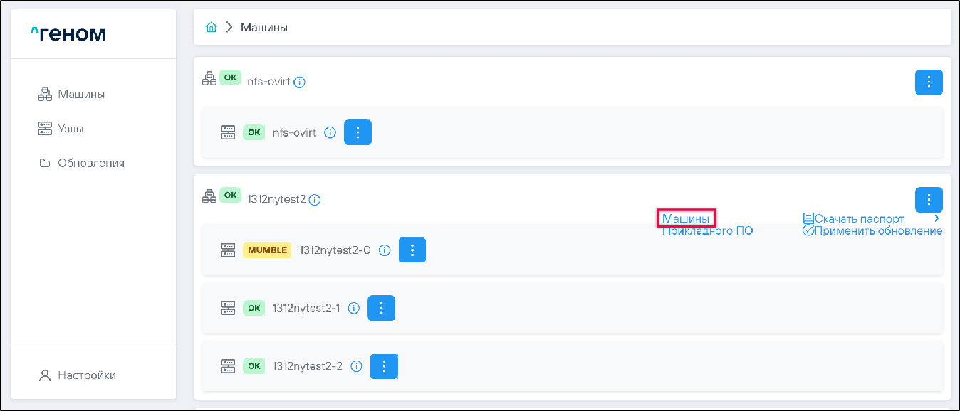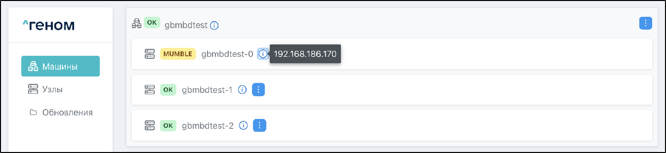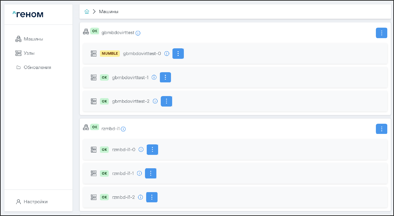 На странице отображается список Машин, которыми управляет экземпляр Модуля. Для каждой Машины показан список входящих в неё узлов: