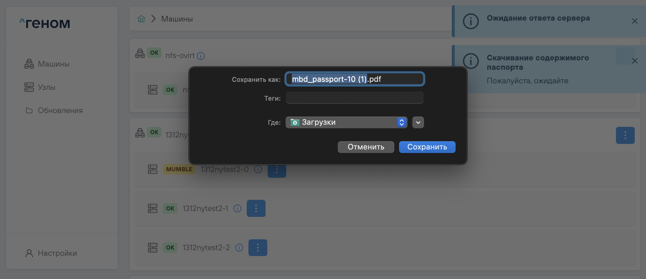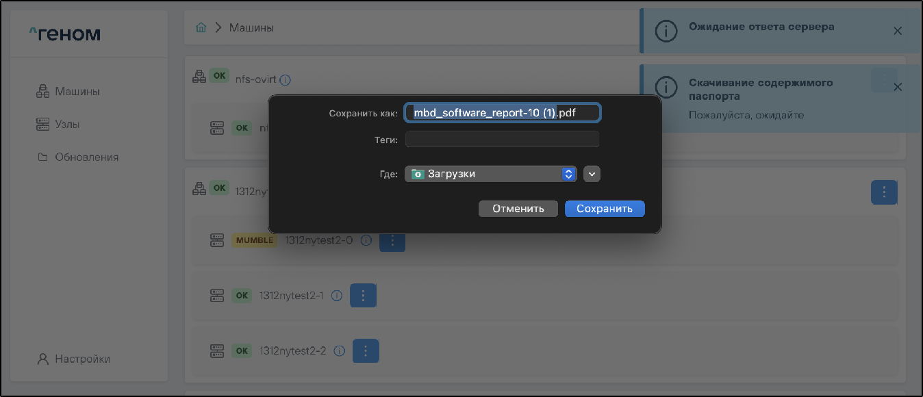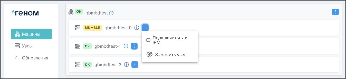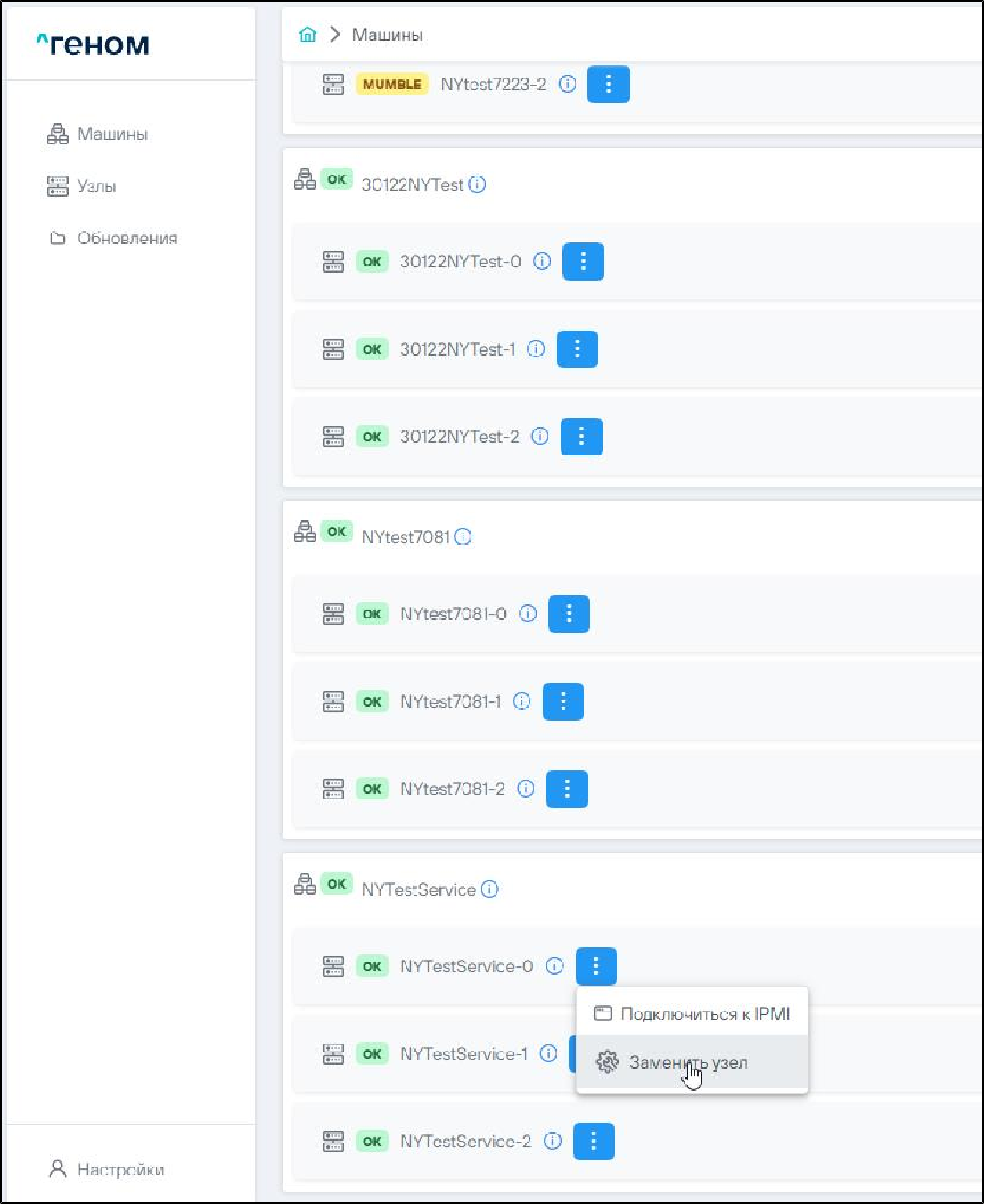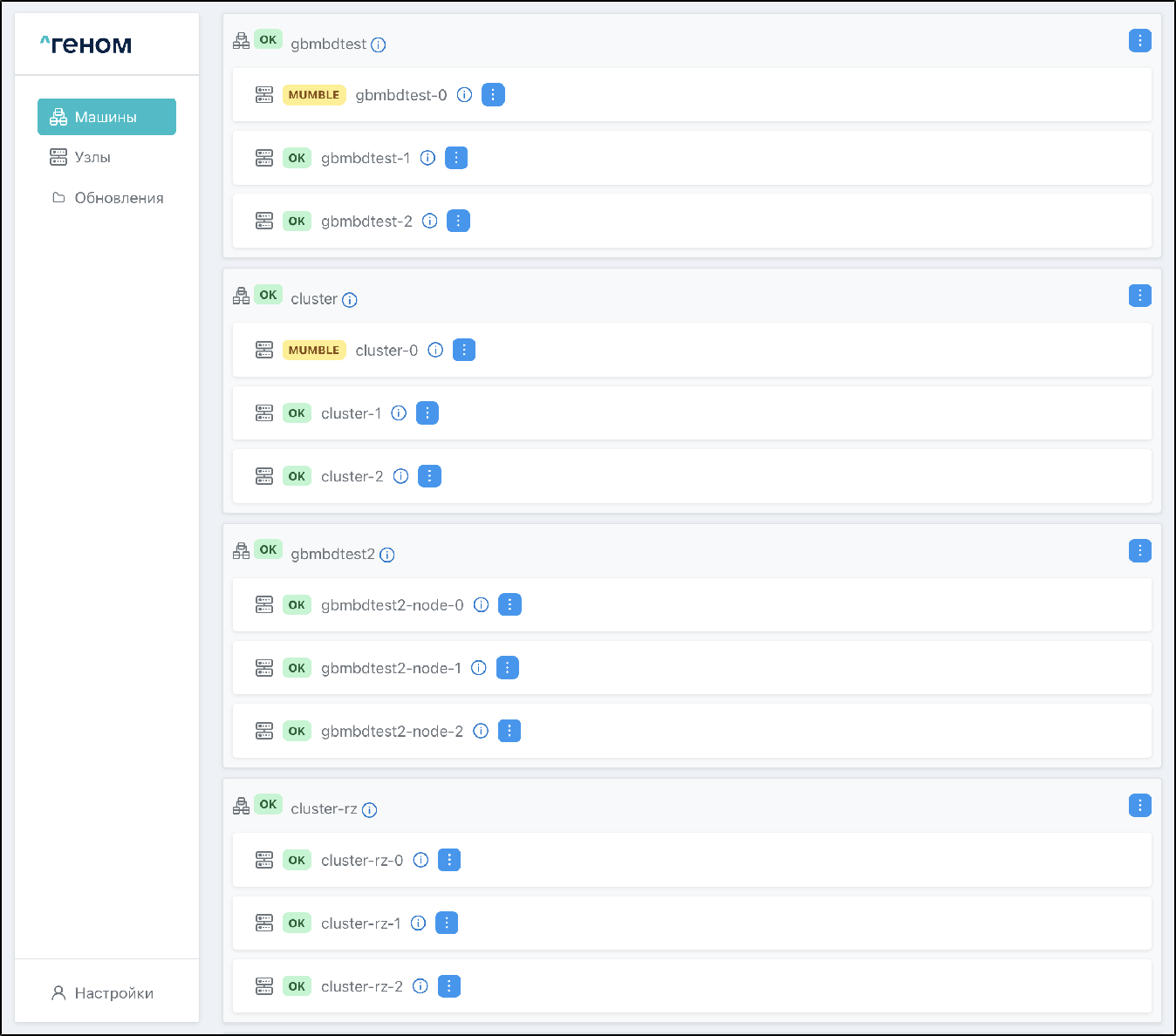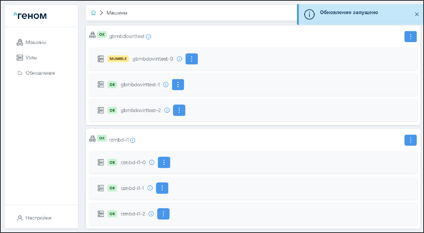 На странице отображается список Машин, которыми управляет экземпляр Модуля. Для каждой Машины показан список входящих в неё узлов: