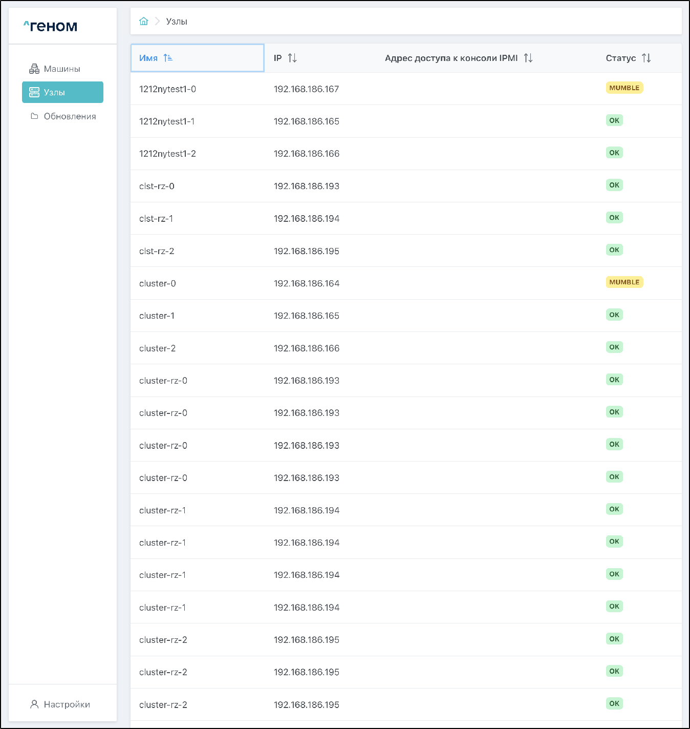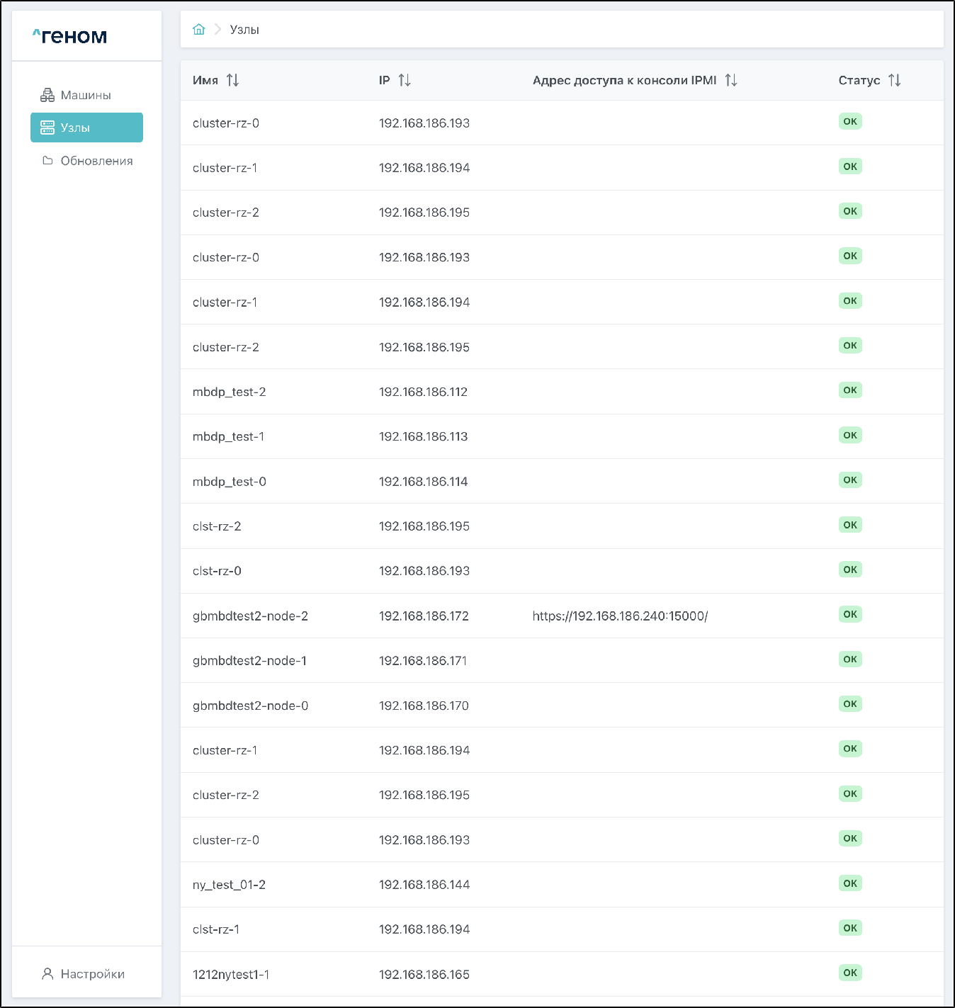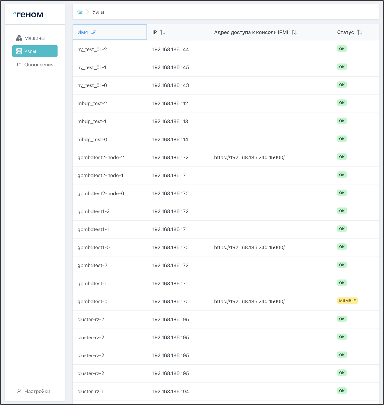 На странице раздела "Узлы" отображается список всех узлов с IP-адресами, адресами доступа к консоли IPMI и текущими статусами: