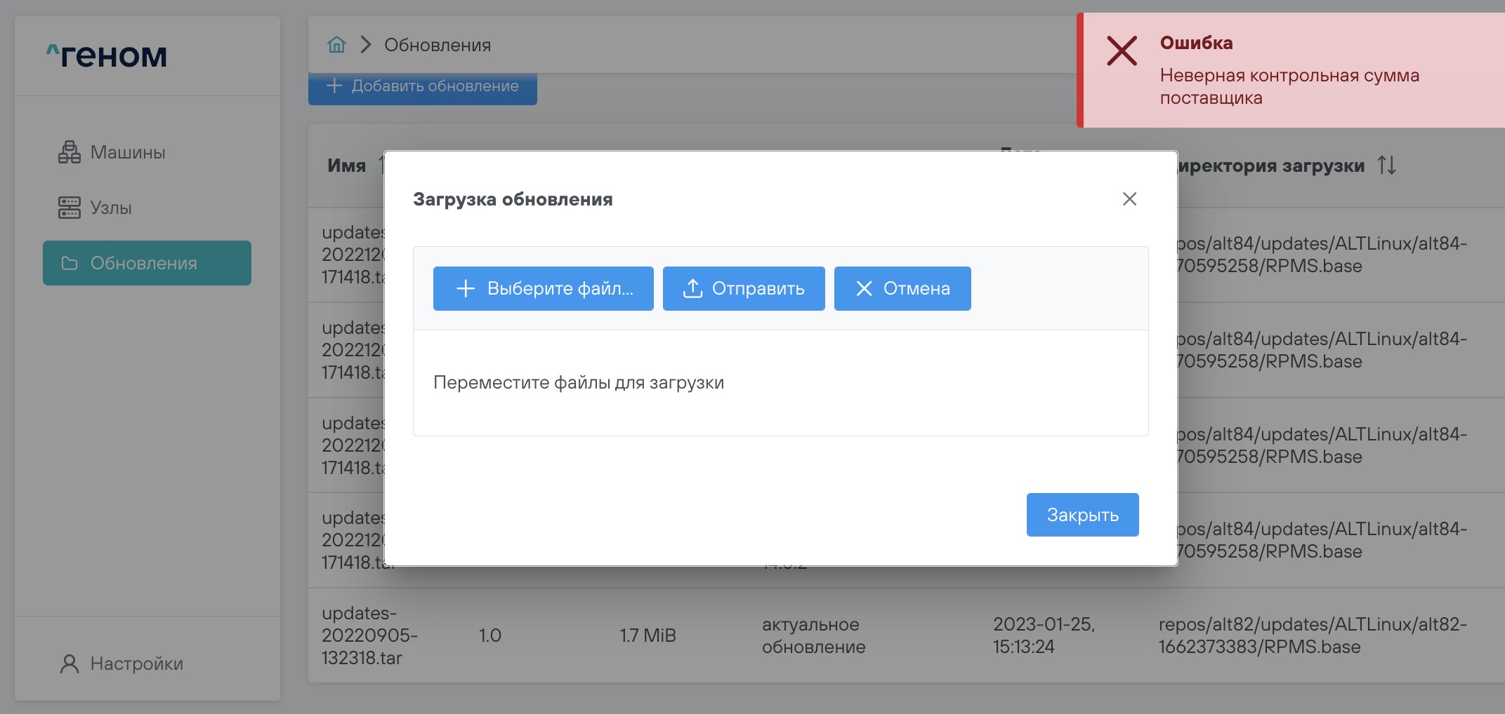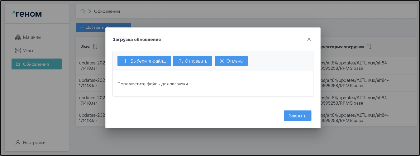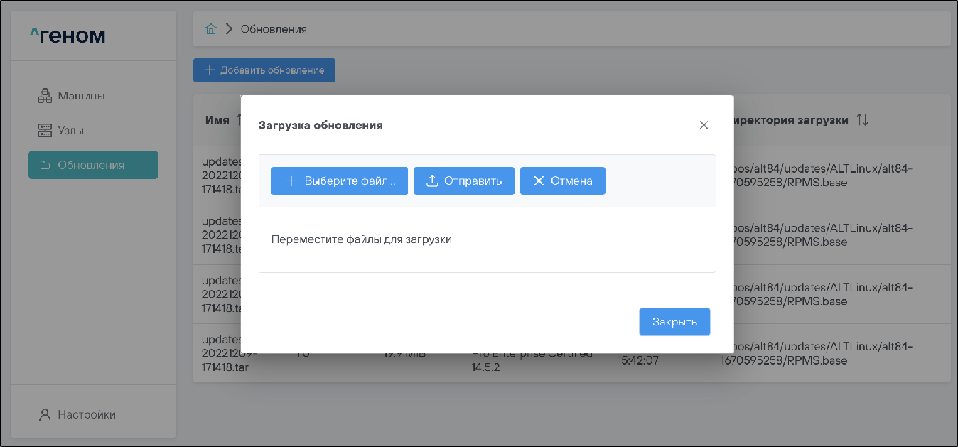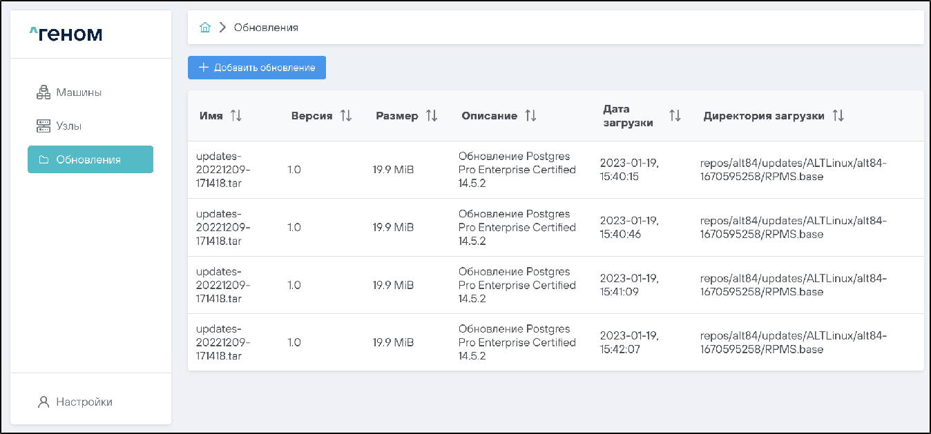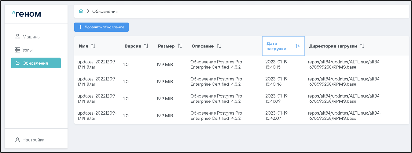 На странице представлен список всех загруженных файлов обновлений.