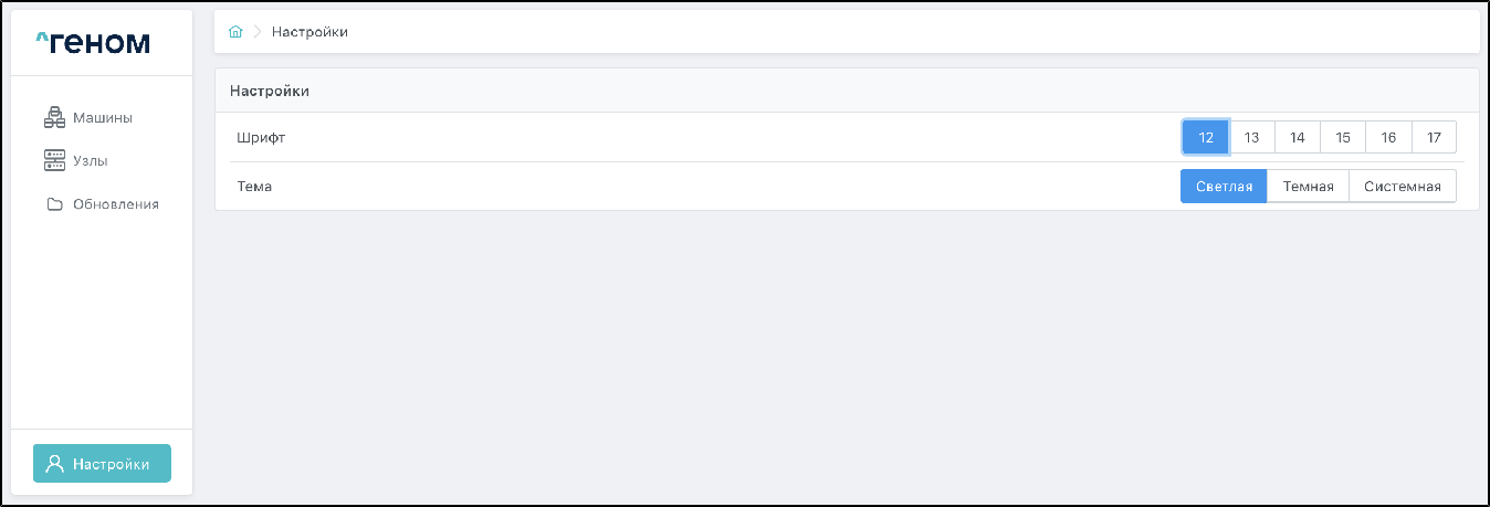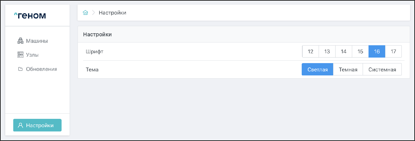 При выборе раздела "Настройки" в левом нижнем углу интерфейса открывается страница с настройками Модуля: