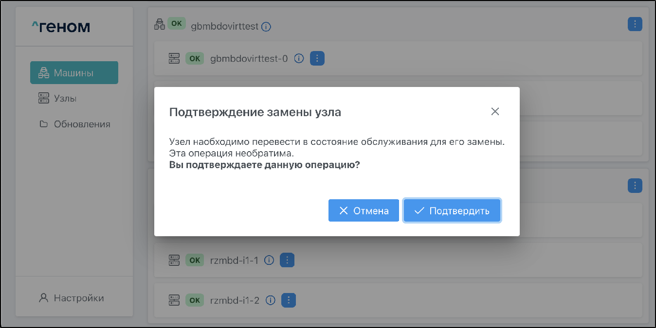 1. Выбрать пункт . Появится окно подтверждения перевода узла в режим обслуживания: