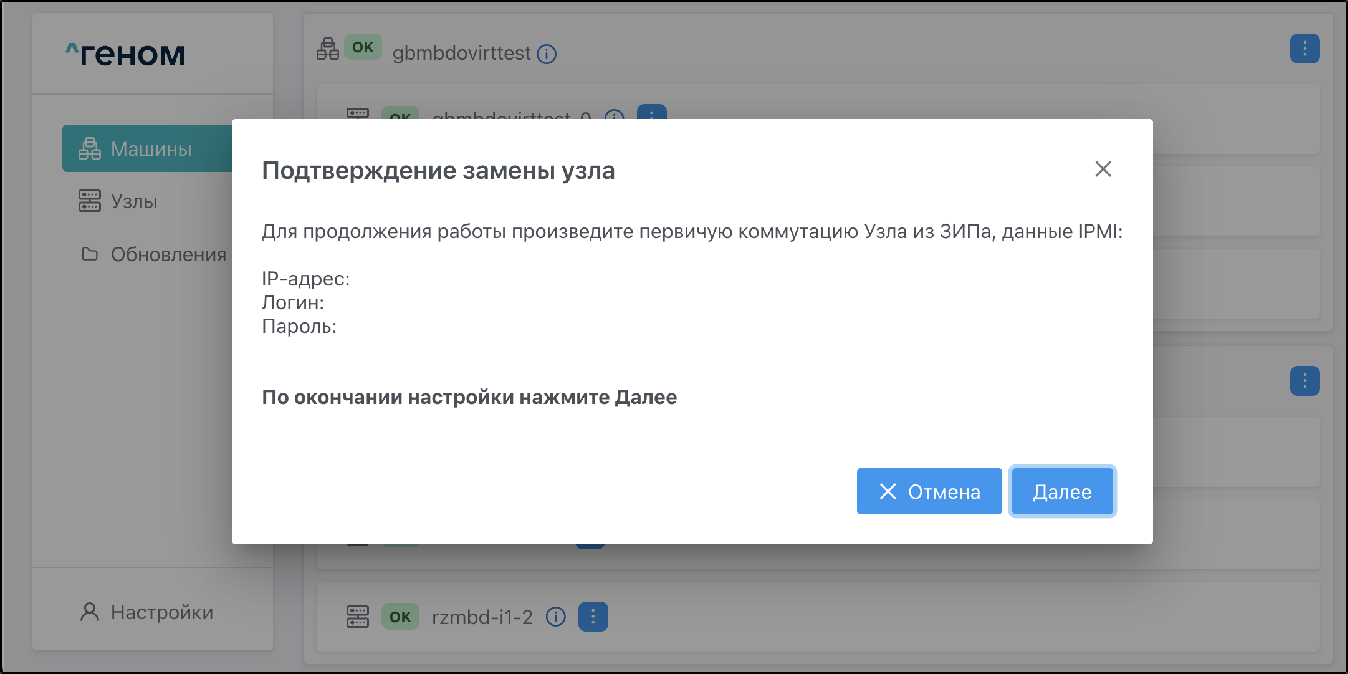 Посредством доступа к Машине по интерфейсу IPMI доступны следующие действия по управлению жизненным циклом модулей в составе Машины: