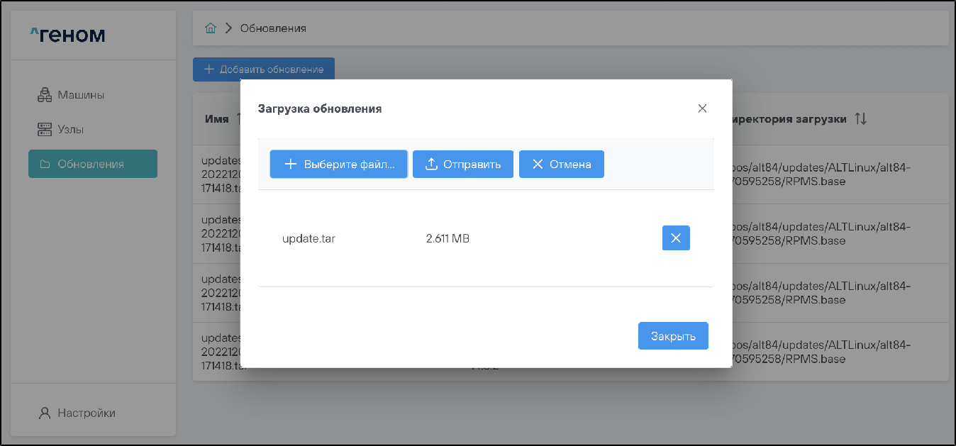 Для загрузки новых обновлений используется кнопка . При её нажатии появляется окно загрузки файла обновления: