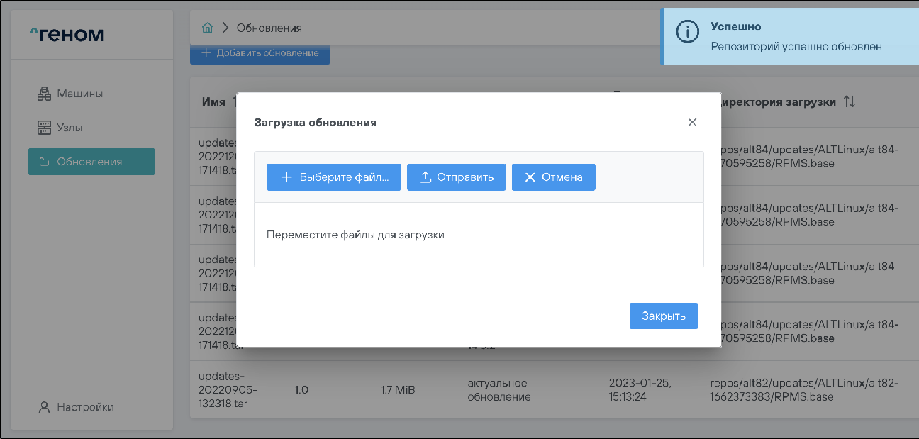 • Если проверка и загрузка файла прошли успешно, появится всплывающее сообщение об успешном обновлении репозитория: