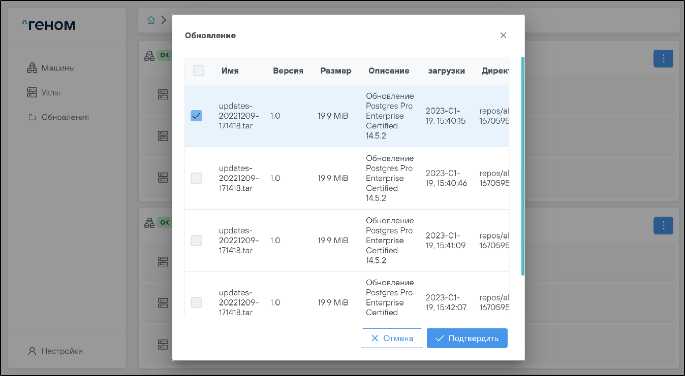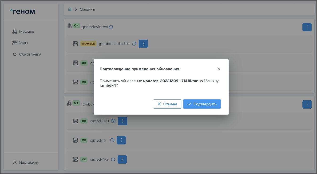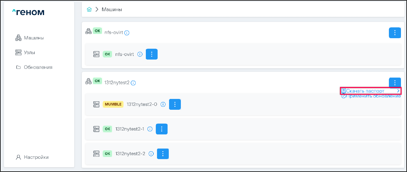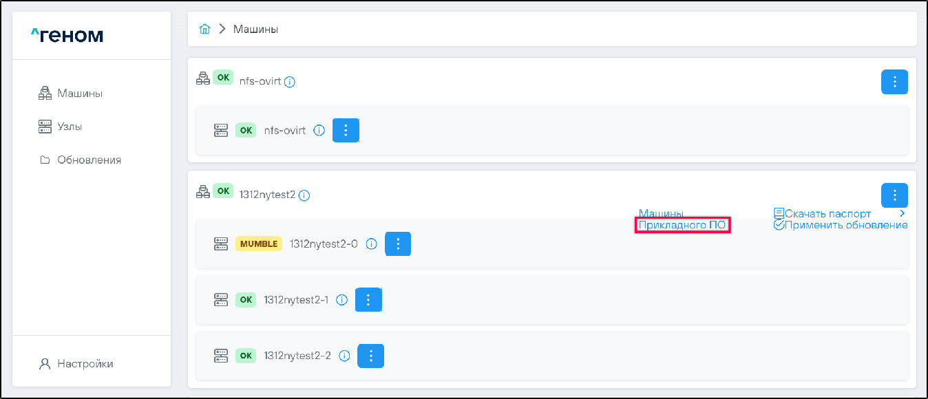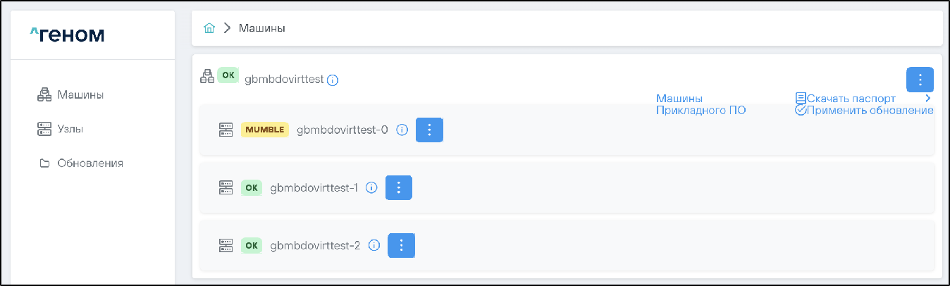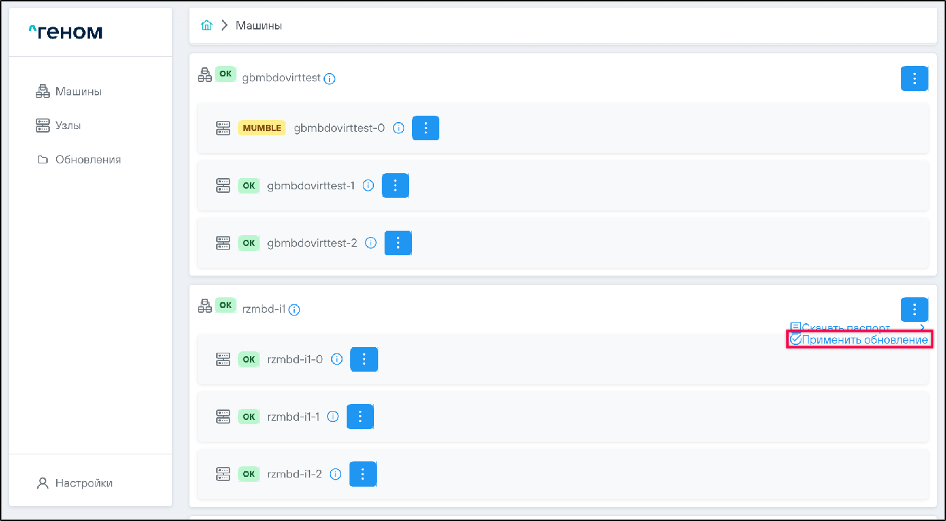 1. Выбрать машину, на которую необходимо установить обновления, нажать на соответствующий ей элемент управления и выбрать пункт :