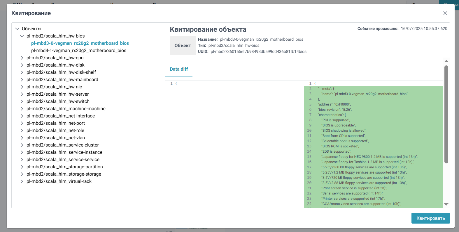 При нажатии кнопки Квитировать все объекты помечаются как квитированные. Квитированные объекты не отображаются при следующем вызове функции отображения изменений, а история их изменений отсчитывается с момента квитирования.