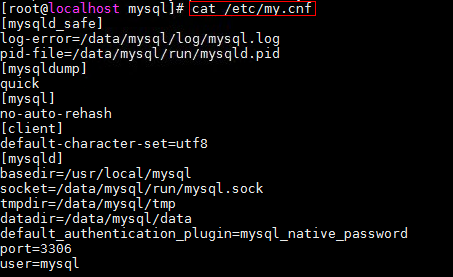 [mysqld_safe] log-error=/data/mysql/log/mysql.log pid-file=/data/mysql/run/mysqld.pid [mysqldump] quick [mysql] no-auto-rehash [client] default-character-set=utf8 [mysqld] basedir=/usr/local/mysql socket=/data/mysql/run/mysql.sock tmpdir=/data/mysql/tmp datadir=/data/mysql/data default_authentication_plugin=mysql_native_password port=3306 user=mysql