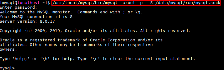 — Если MySQL установлен с помощью пакета RPM, полученного с официального сайта, файл mysqld находится в каталоге /usr/sbin. Убедитесь, что в команде указан правильный каталог.$ /usr/local/mysql/bin/mysql -uroot -p -S /data/mysql/run/mysql.sock