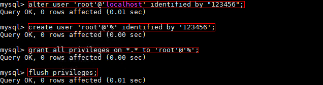 mysql>grant all privileges on *.* to 'root'@'%'; mysql>flush privileges;