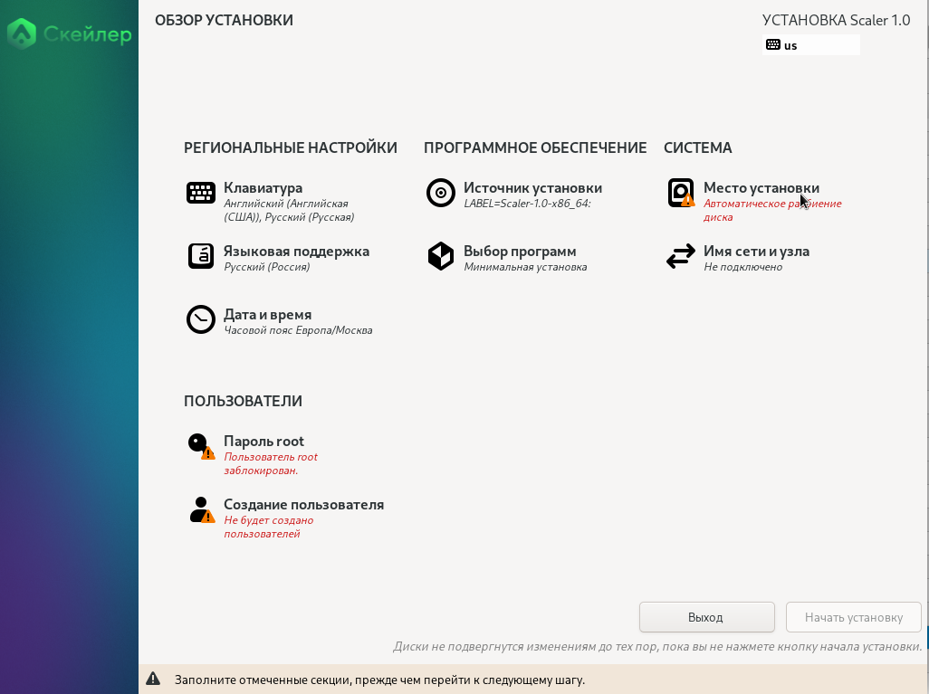 Вы можете нажать кнопку Начать установку для проведения штатной установки системы, только когда все сигналы предупреждения будут устранены.