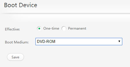 Установите для параметров Effective (Действие) и Boot Medium (Среда загрузки) значения One-time (Однократно) и DVD-ROM соответственно и нажмите кнопку Save (Сохранить), как показано на рисунке 1.
