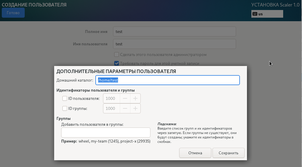 На рисунке 11 показана страница создания пользователя. Введите имя пользователя и задайте пароль. Требования к сложности пароля такие же, как и для пароля учетной записи root. Кроме того, можно задать домашний каталог и группу пользователей, нажав кнопку Дополнительно, как показано на рисунке 12.