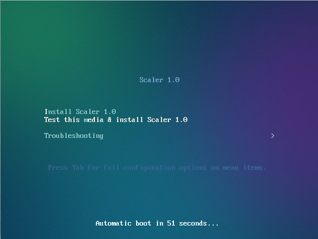 - Если вы не выполняете никаких действий в течение 1 минуты, система автоматически выбирает вариант по умолчанию Install Scaler 1.0 (Проверить этот носитель и установить Скейлер 1.0) и переходит на страницу установки.