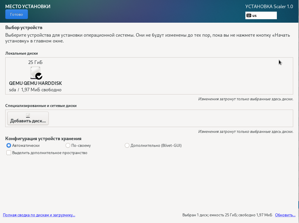 На странице мастера установки нажмите клавишу Ввод для выбора параметра по умолчанию Install Scaler 1.0 (установить Scaler OS 1.0), чтобы открыть страницу установки с графическим пользовательским интерфейсом.