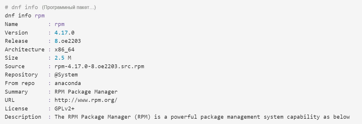 Чтобы запросить пакет RPM (dnf), установленный в системе Linux, используйте параметр -q в команде rpm.