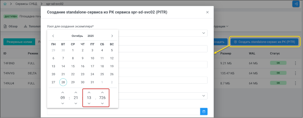 - Изменен формат времени восстановления в форме создания standalone-сервиса из РК (PITR) – добавлена поддержка ввода секунд и миллисекунд.