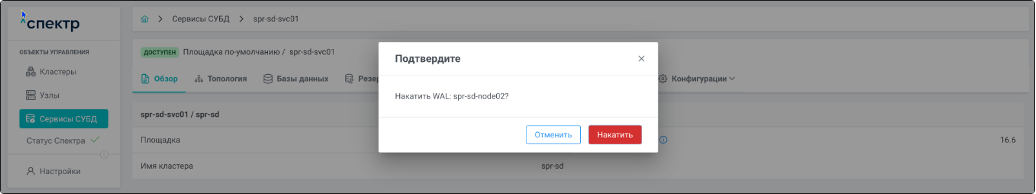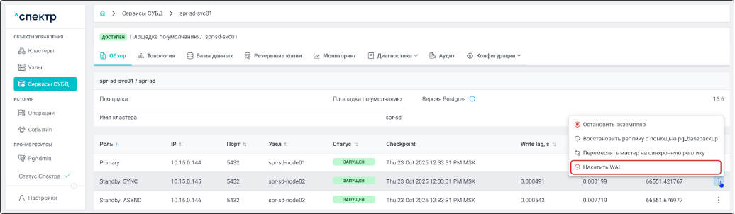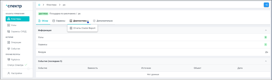 | Кластер | Объект управления верхнего уровня; группа узлов, на которой запускаются сервисы СУБД. Для обеспечения отказоустойчивости сервисов СУБД используется инструмент Pacemaker/Corosync. |