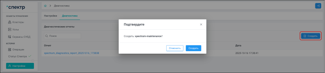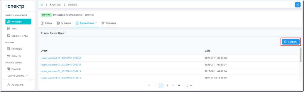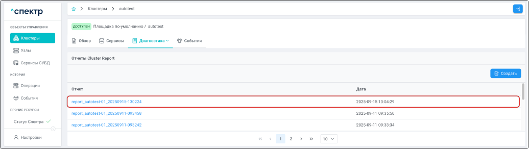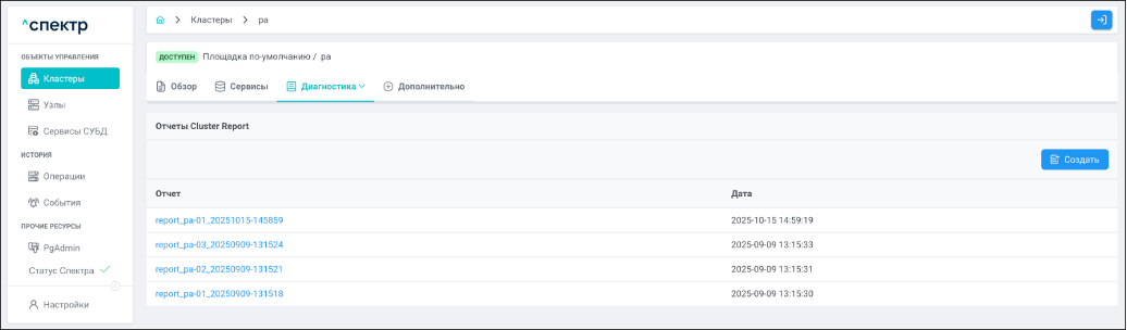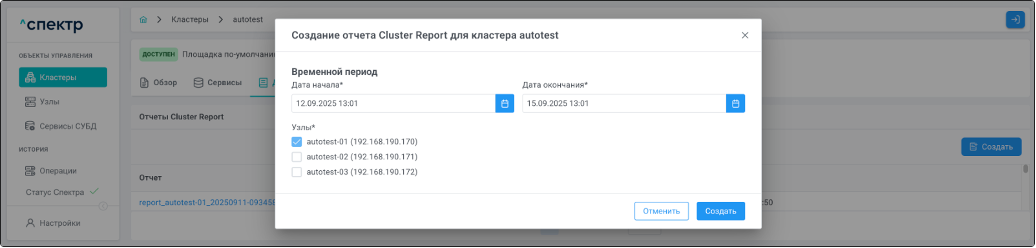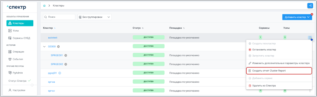 - создания отчётов cluster report;