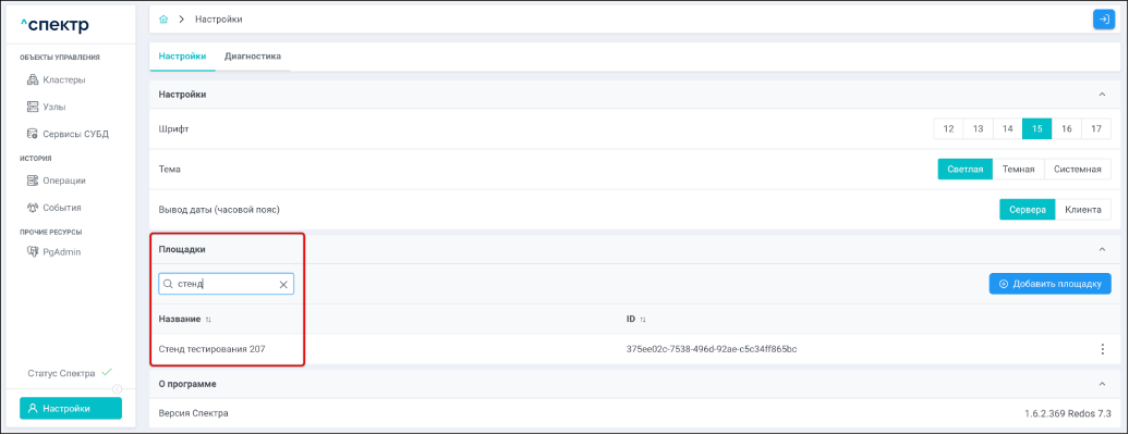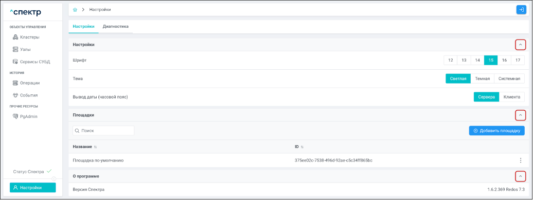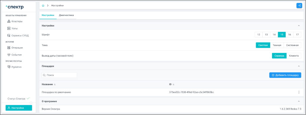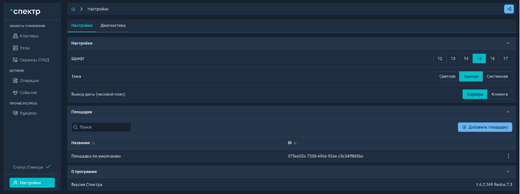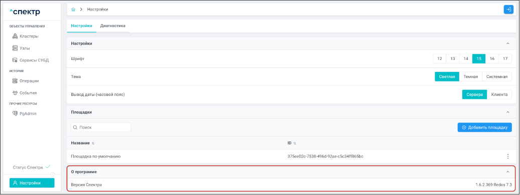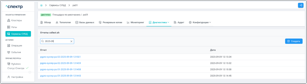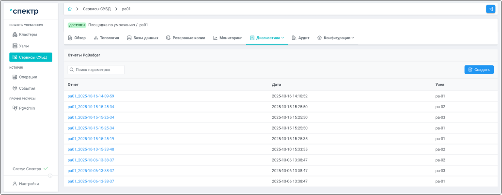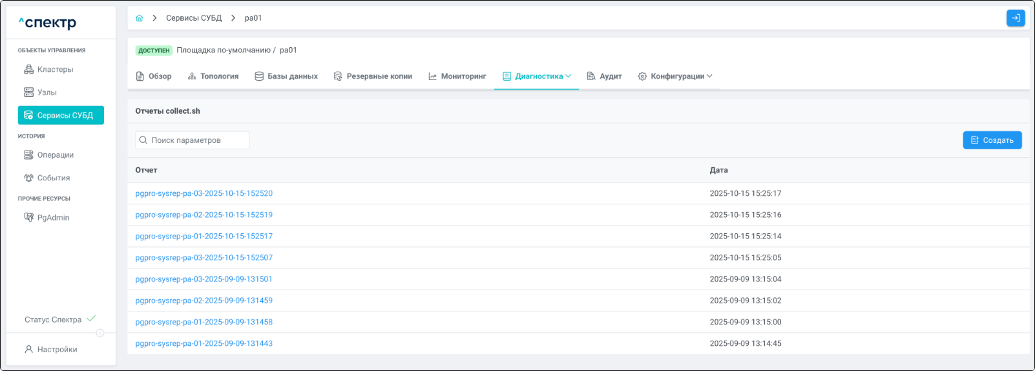 | Агент Спектра | Специализированное программное обеспечение, которое устанавливается на узлы кластера и используется в работе ПО «Скала^р Спектр» для выполнения следующих задач: получение актуальной конфигурации кластера; получение и обновление конфигураций СУБД и программы управляющей пулом соединений PgBouncer; выполнение операций с кластером, сервисами, узлами; предоставление метрик о состоянии кластера, узлов, сервисов СУБД, баз данных для системы мониторинга. |