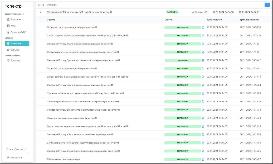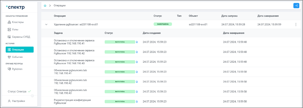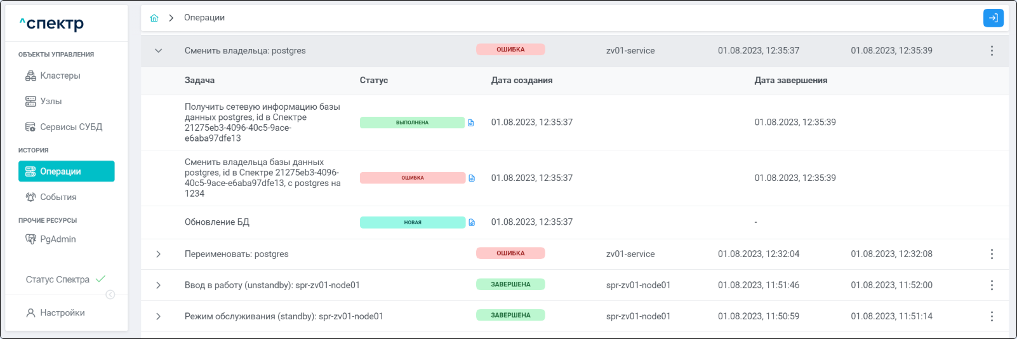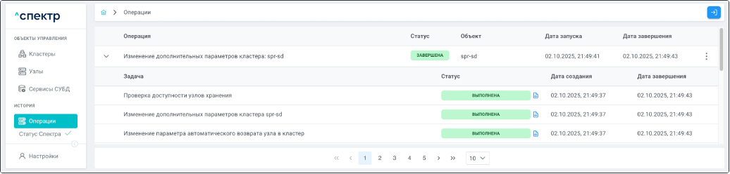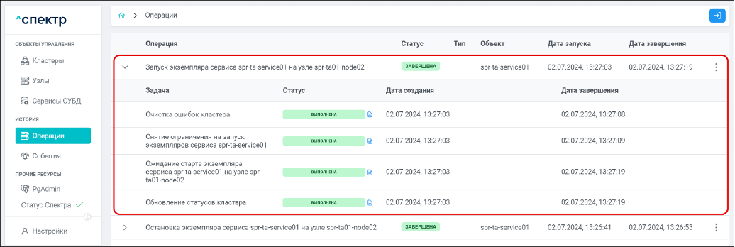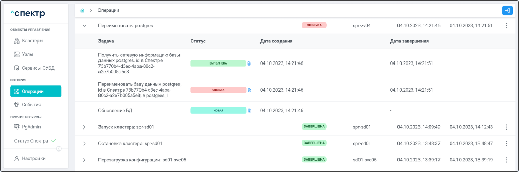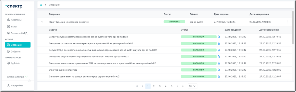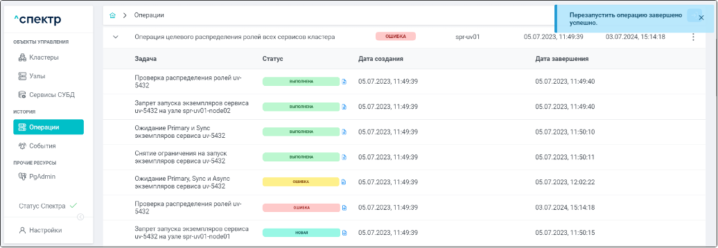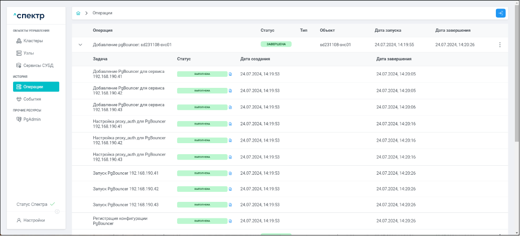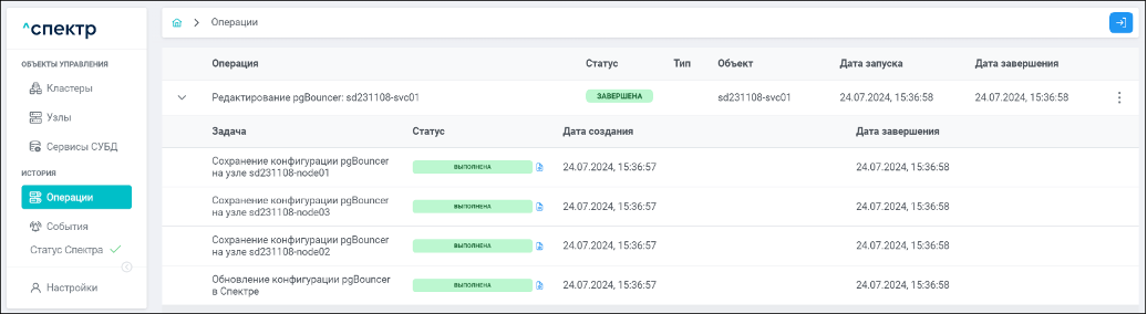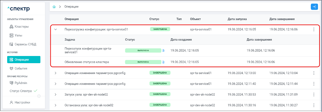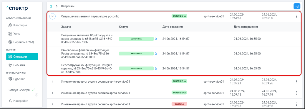 По нажатию кнопки “Перейти” во всплывающем сообщении будет осуществлен переход на страницу “Операции”. Операция изменения параметров pgconfig со статусом “НОВАЯ” и, далее, со статусом “ЗАВЕРШЕНА” появится в верхней строке.