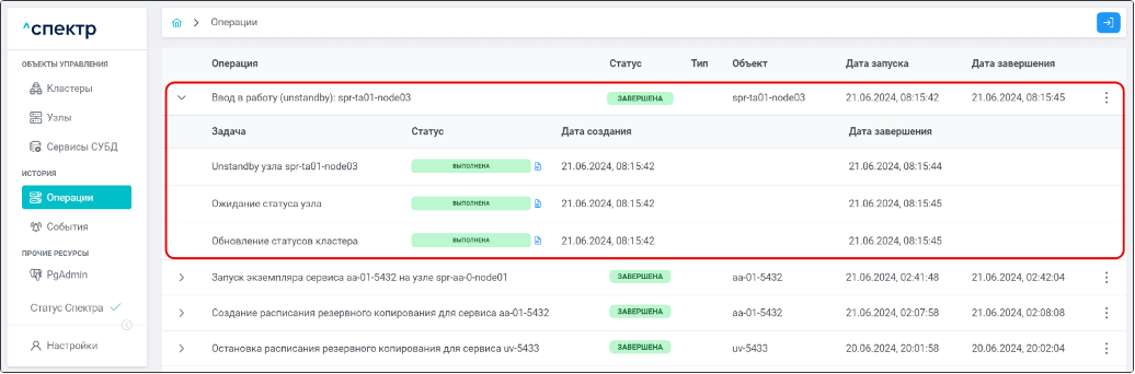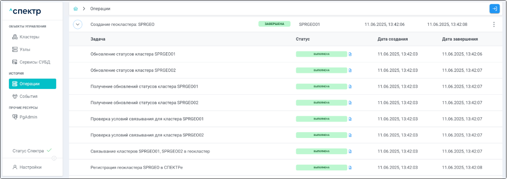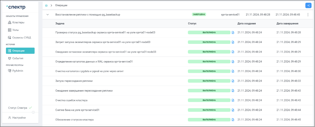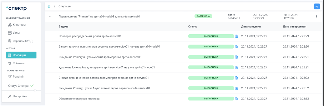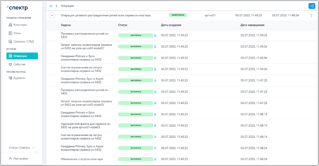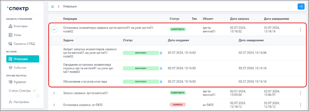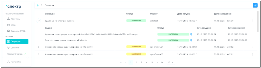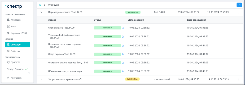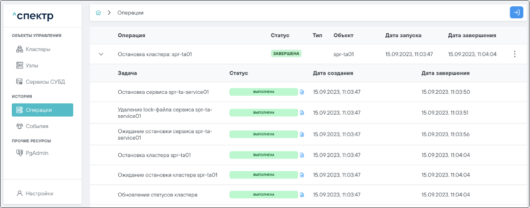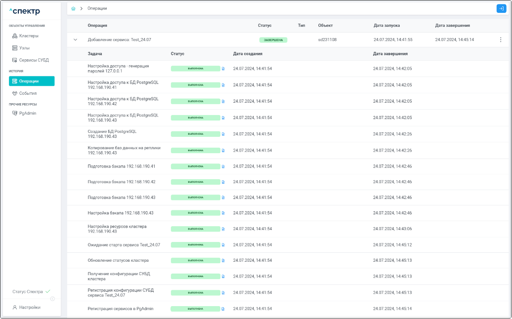По нажатию кнопки “Перейти” во всплывающем сообщении будет осуществлен переход на страницу “Операции”. Операция изменения параметров pgconfig со статусом “НОВАЯ” и, далее, со статусом “ЗАВЕРШЕНА” появится в верхней строке.