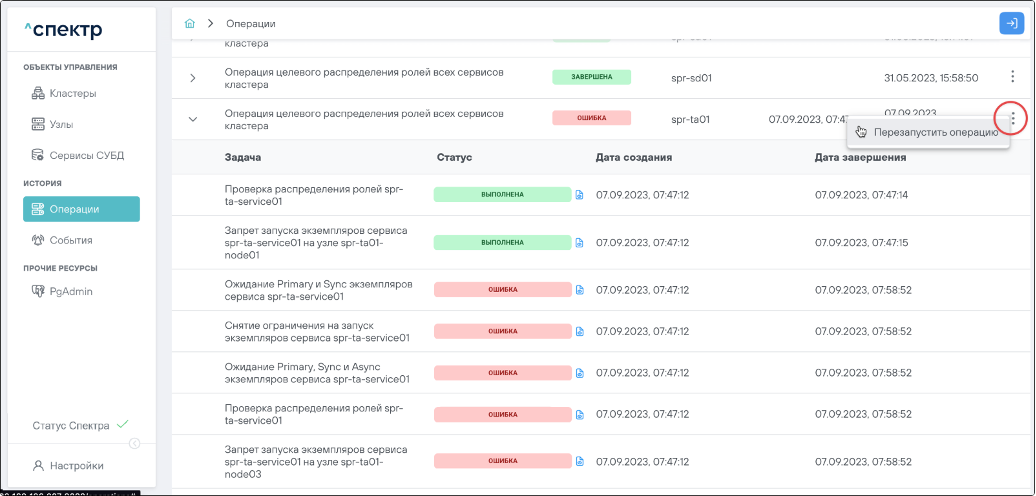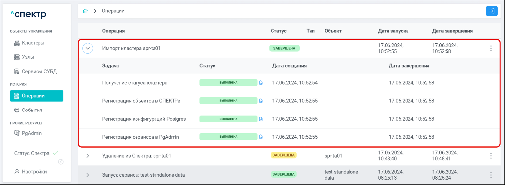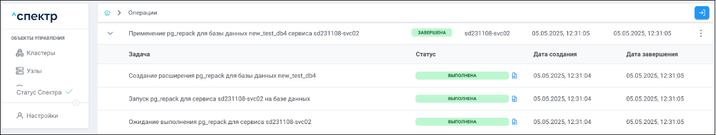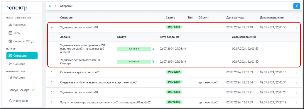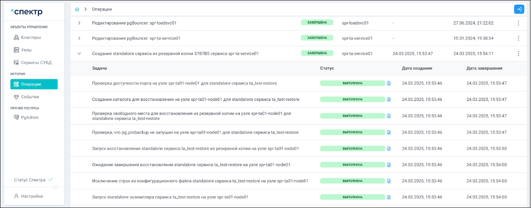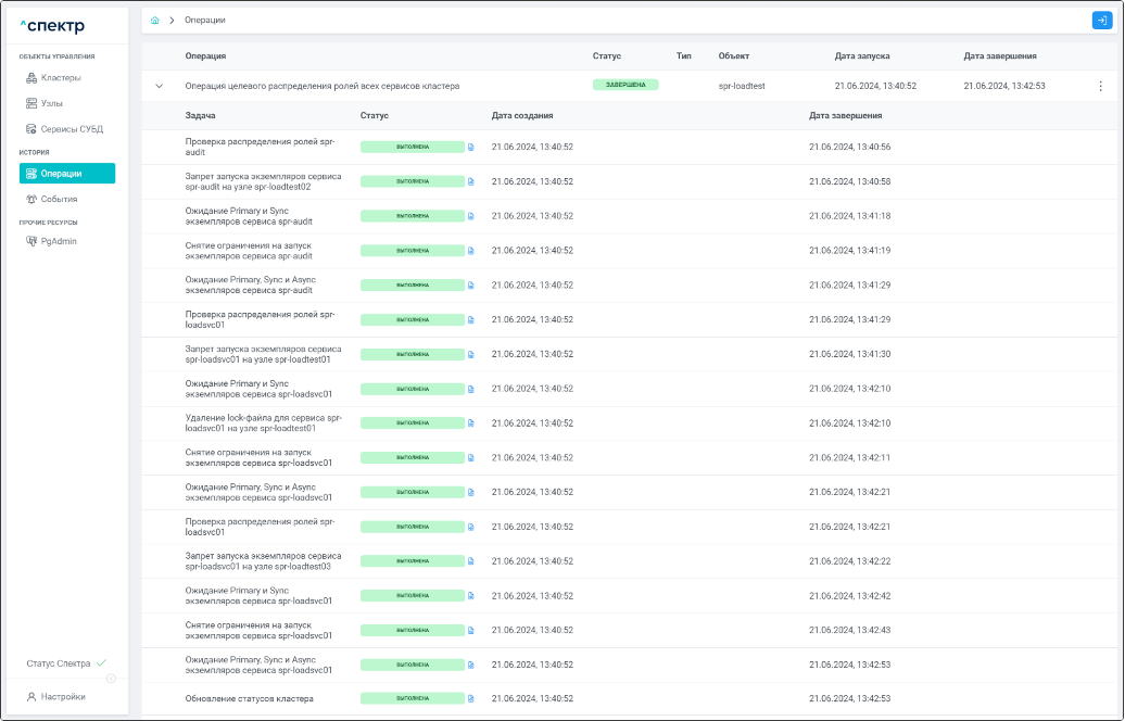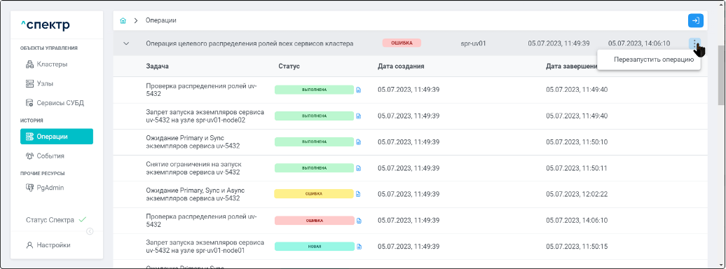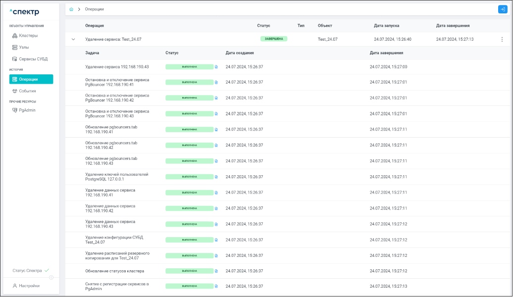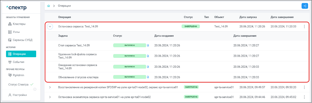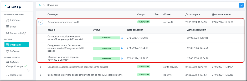 По нажатию кнопки “Перейти” во всплывающем сообщении будет осуществлен переход на страницу “Операции”. Операция изменения параметров pgconfig со статусом “НОВАЯ” и, далее, со статусом “ЗАВЕРШЕНА” появится в верхней строке.