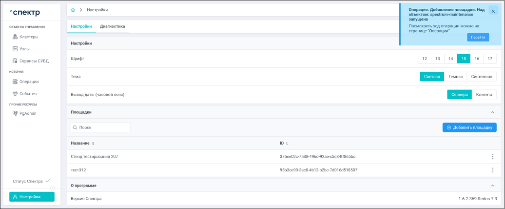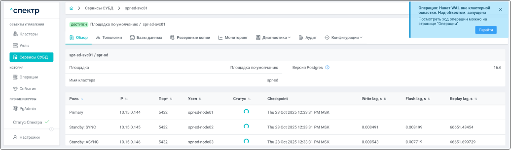 В правом верхнем углу страницы появится всплывающее сообщение о запуске операции изменения параметров pg_hba: