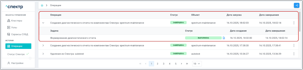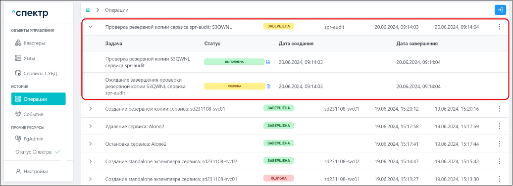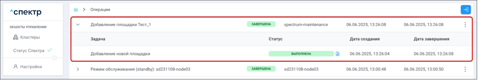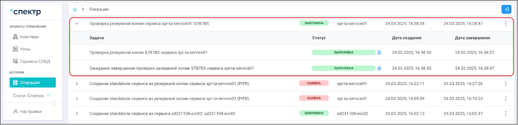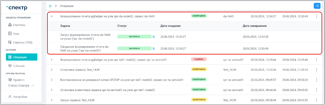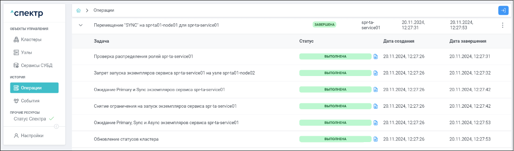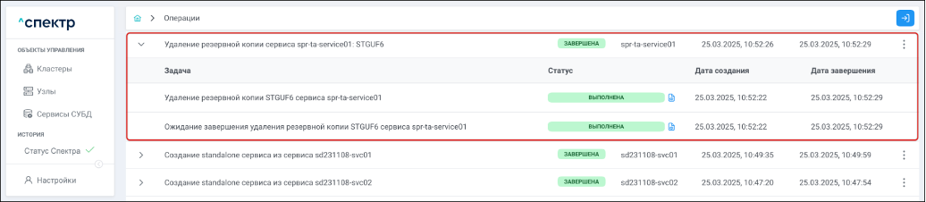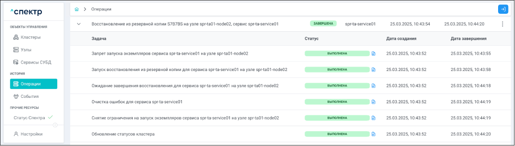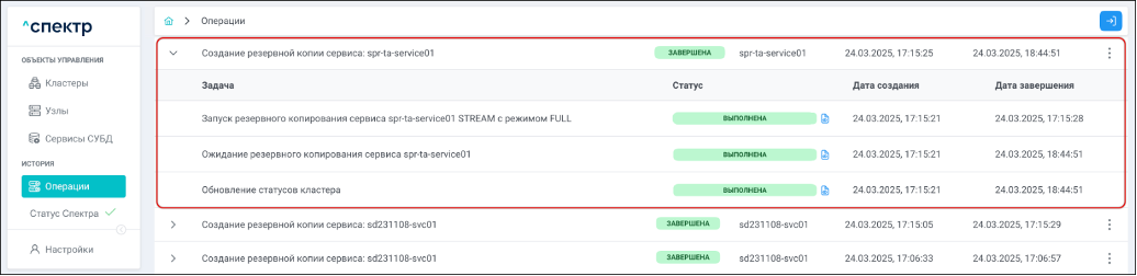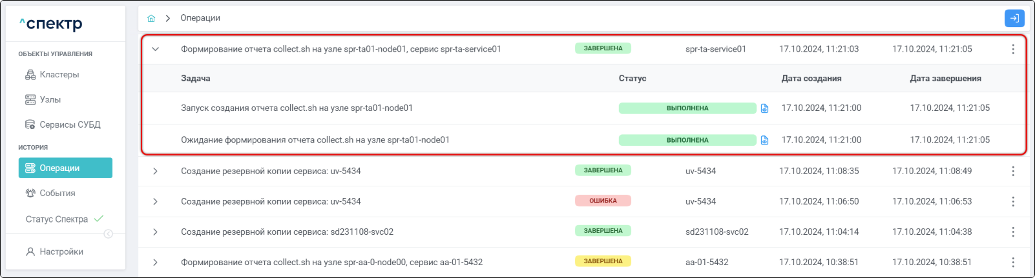 Для раскрытия / скрытия списка задач операции с актуальными статусами их выполнения нужно нажать на элемент управления