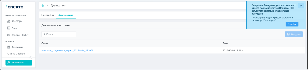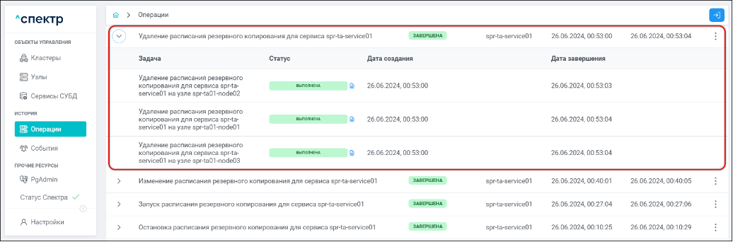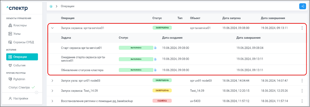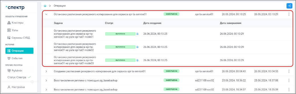 По нажатию кнопки “Перейти” во всплывающем сообщении будет осуществлен переход на страницу “Операции”. В верхней строке таблицы операций отображается операция изменения параметров pg_hba и статус её выполнения.