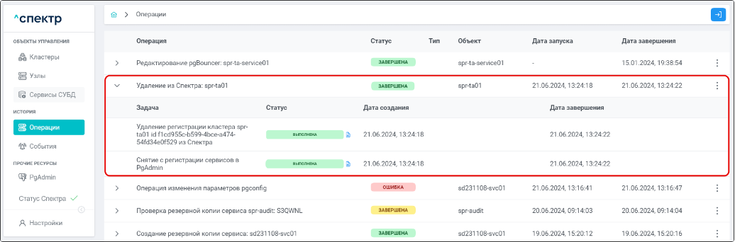 - удаления из Спектра;