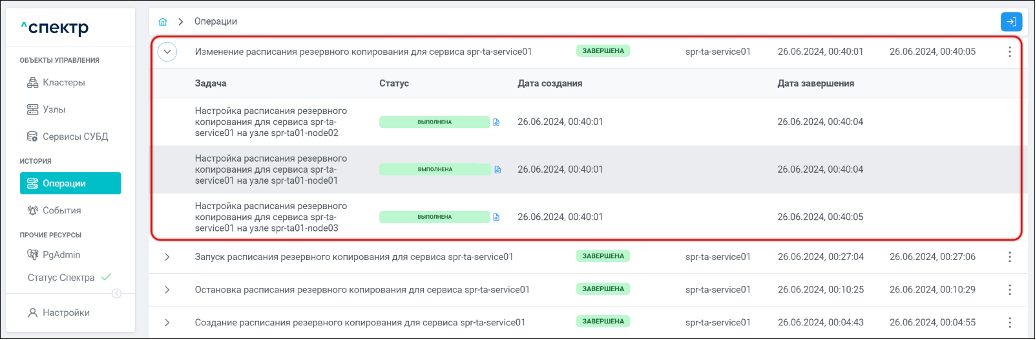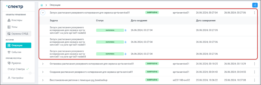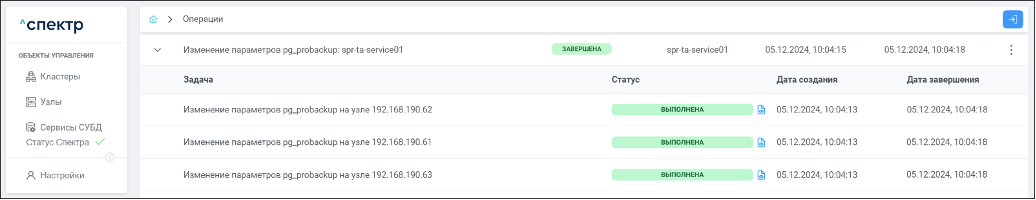 По нажатию кнопки “Перейти” во всплывающем сообщении будет осуществлен переход на страницу “Операции”. В верхней строке таблицы операций отобразится операция изменения параметров pg_probackup и статус её выполнения.
