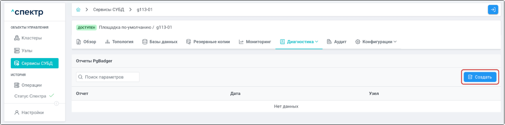 Нажать на имя сервиса для перехода на страницу со вкладками просмотра информации о выбранном сервисе и перейти на вкладку “Базы данных”.
