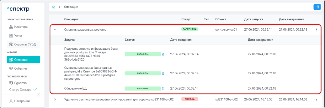 Операция смены владельца БД со статусом “НОВАЯ” и, далее, со статусом “ЗАВЕРШЕНА” появится в верхней строке.