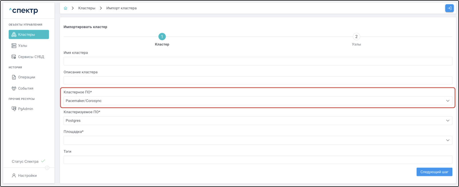 При импорте найденного кластера в списке доступного кластерного ПО присутствуют неподдерживаемый вариант “Patroni”.