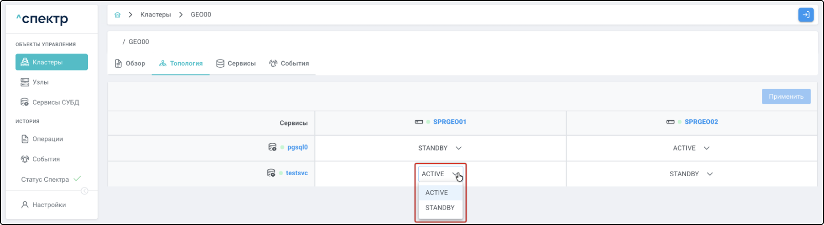 На вкладке “Топология” геокластера появилась возможность переключения между площадками активной и резервной частей геосервиса: