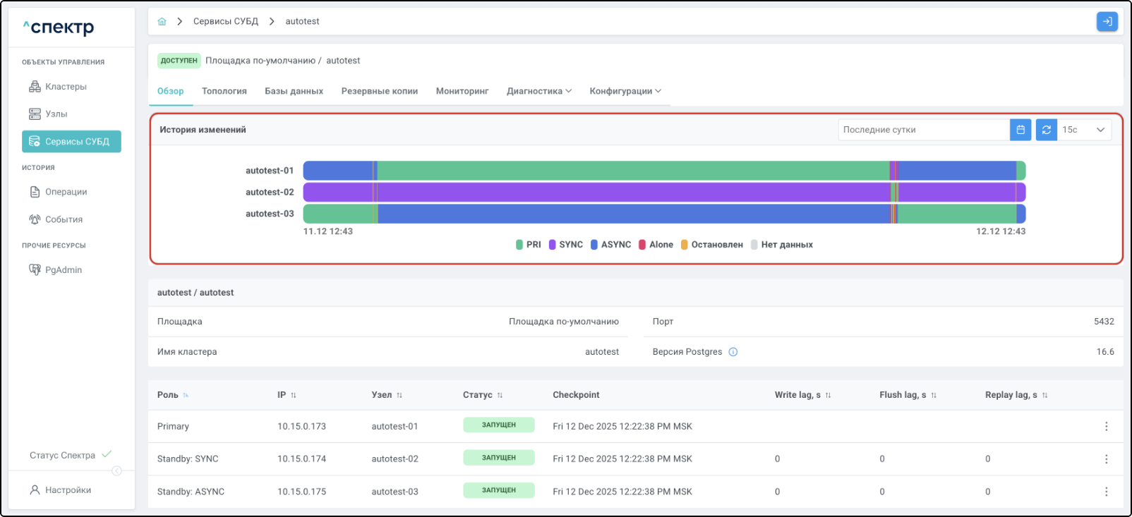 На вкладке “Обзор” сервисов добавлена линейная диаграмма истории смены ролей экземпляров сервисов с возможностью выбора отображаемого периода и периода обновления данных: