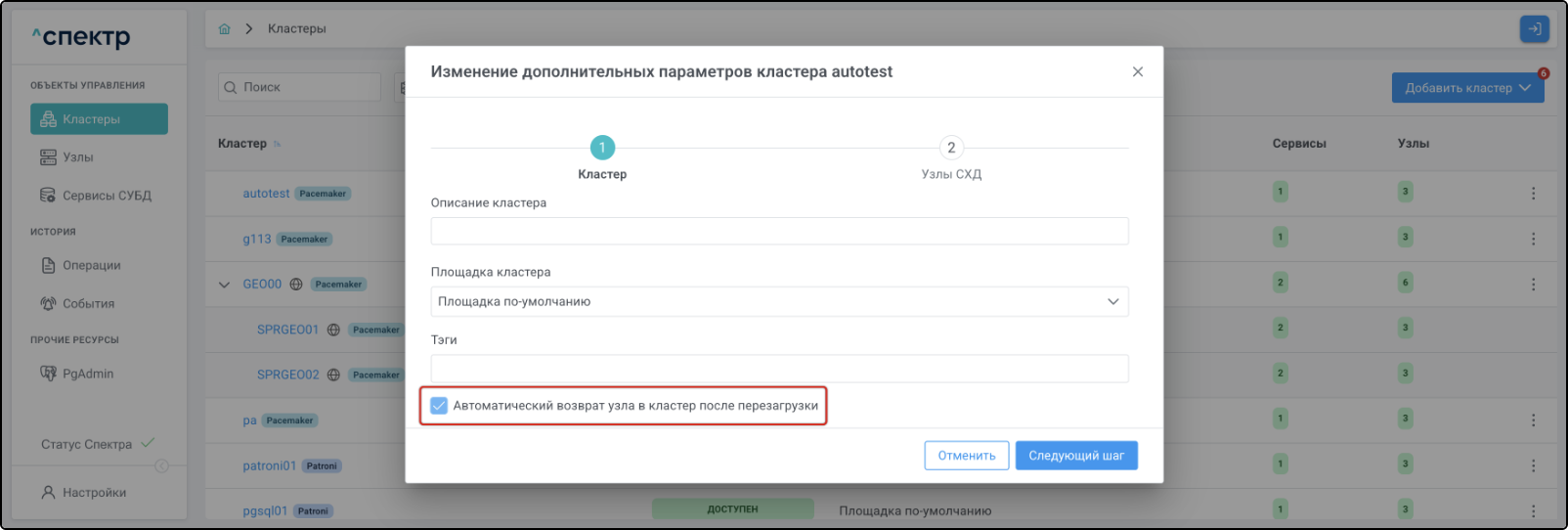 При изменении дополнительных параметров кластера появилась возможность выбора автоматического возврата узла в кластер после перезагрузки: