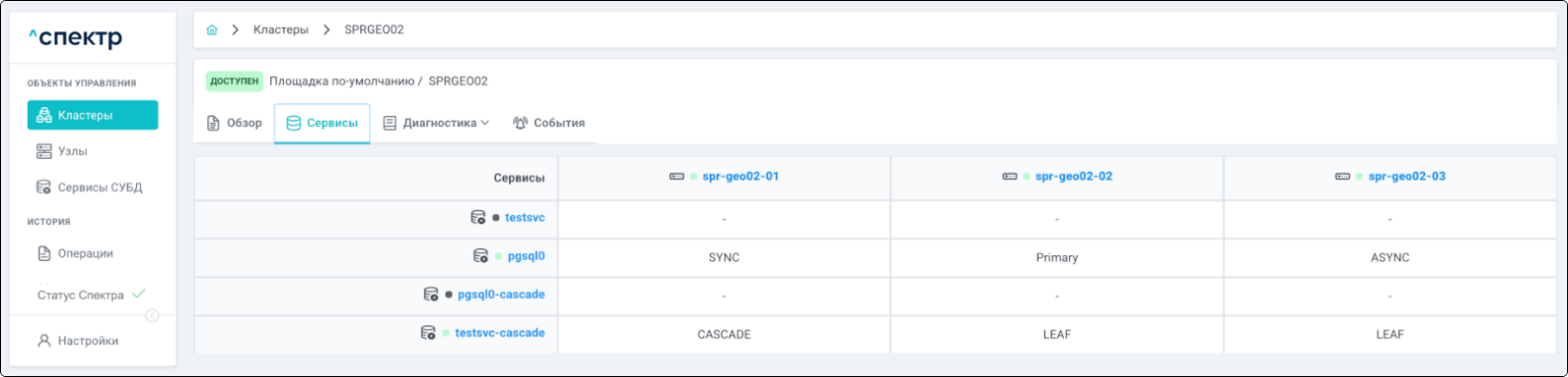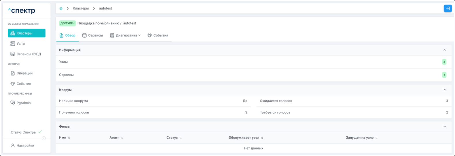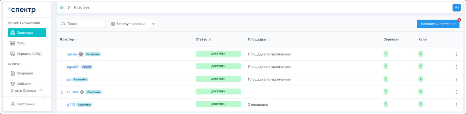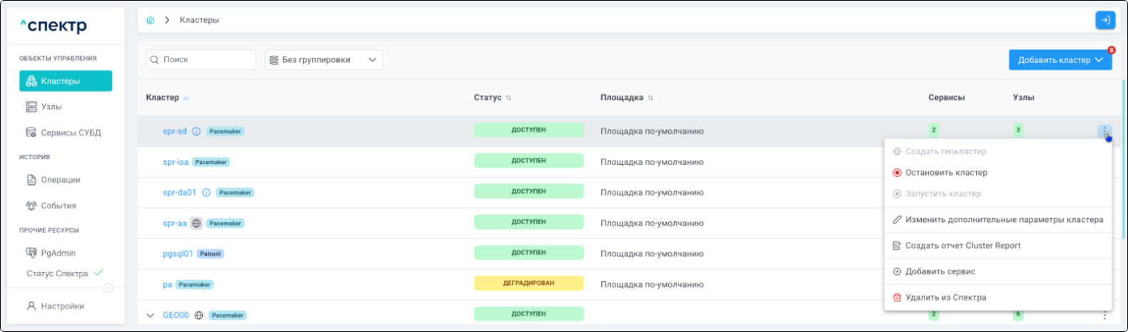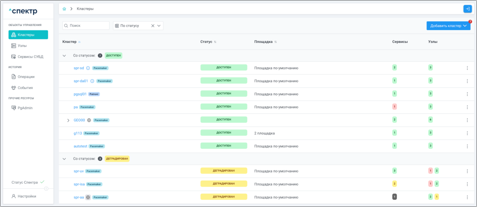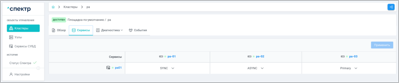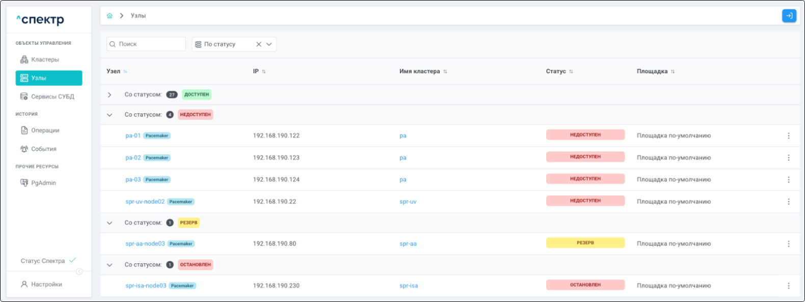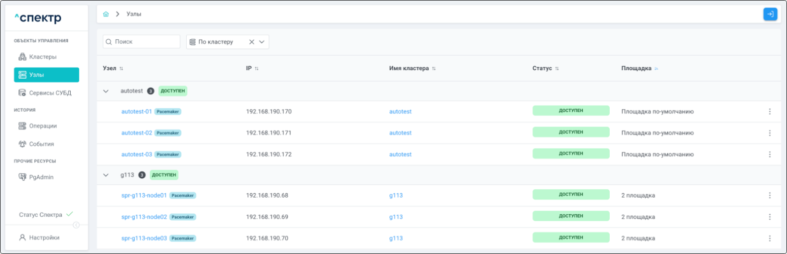 | Кластер | Объект управления верхнего уровня; группа узлов, на которой запускаются сервисы СУБД. Для обеспечения отказоустойчивости сервисов СУБД используется инструмент Pacemaker/Corosync. |