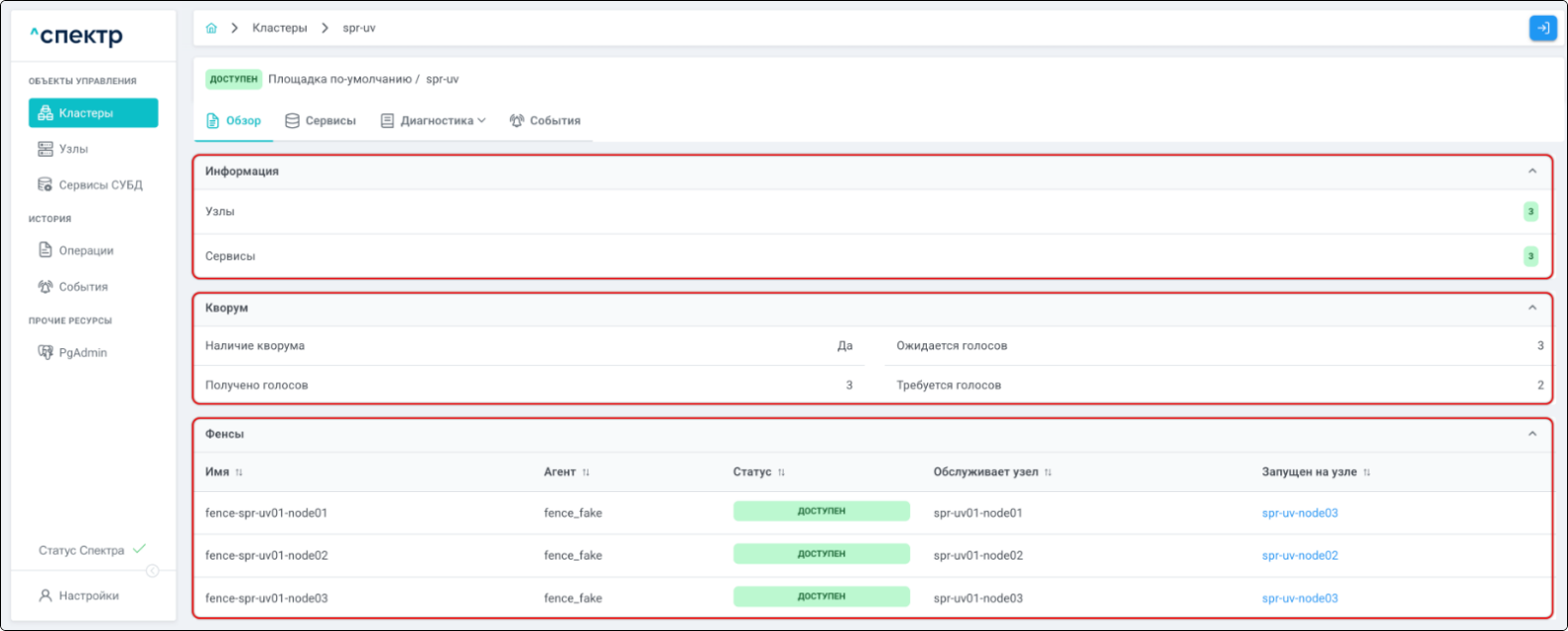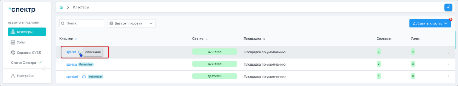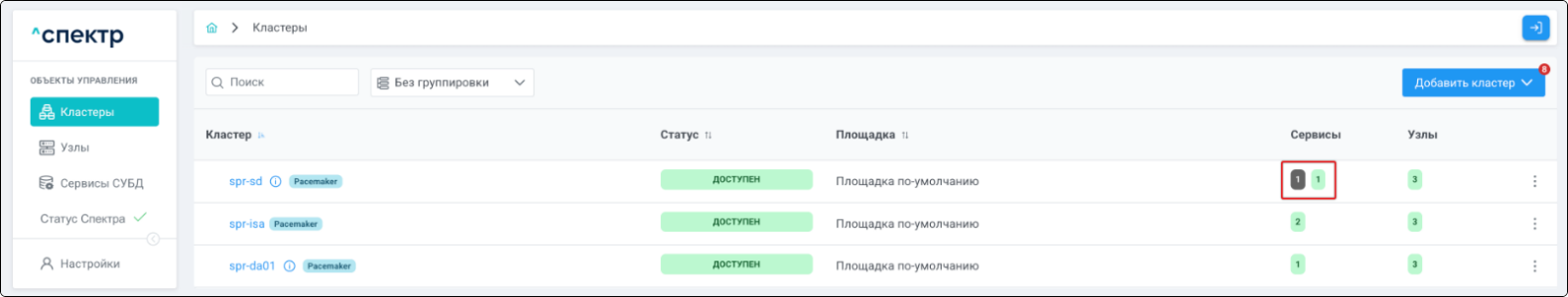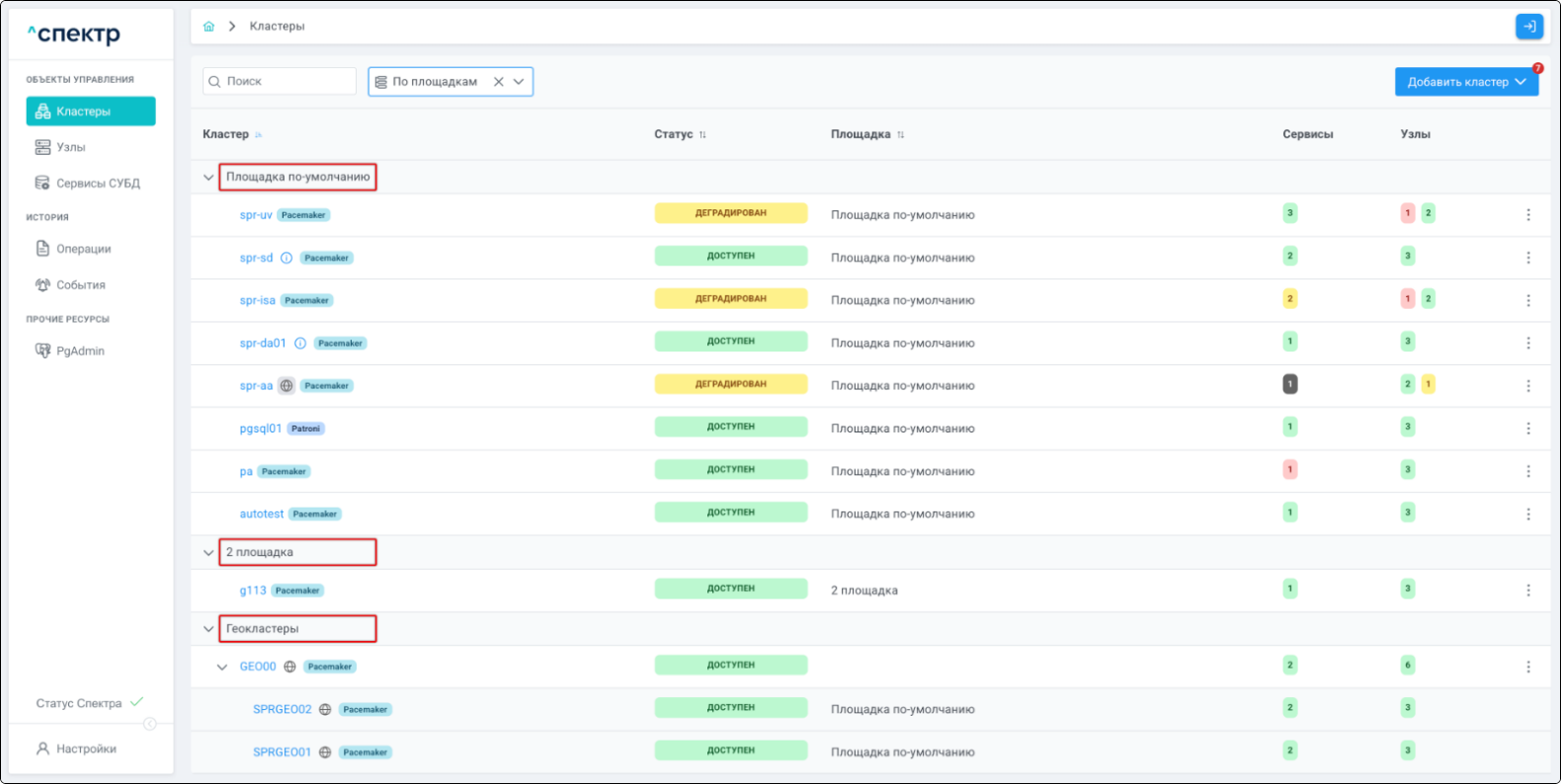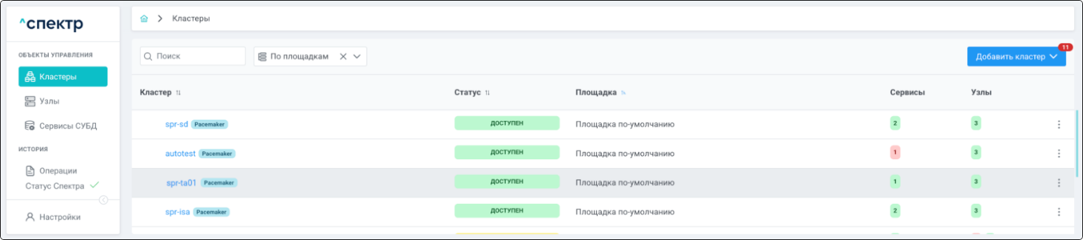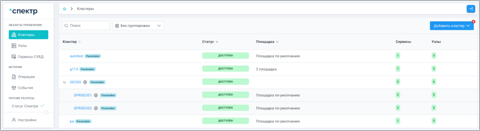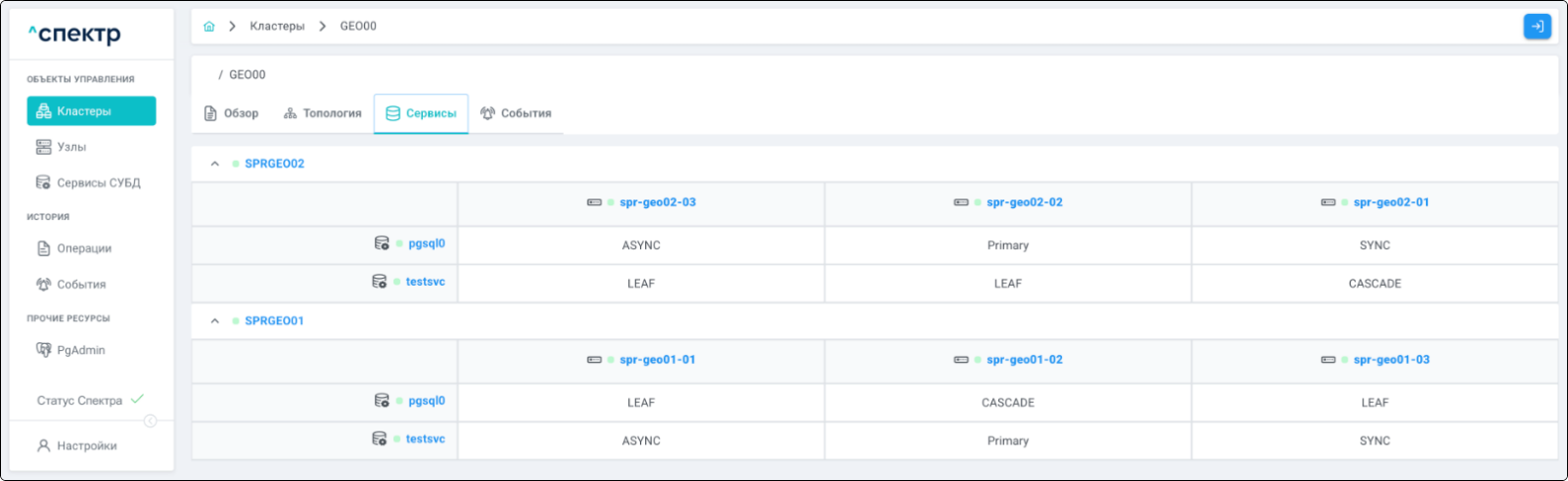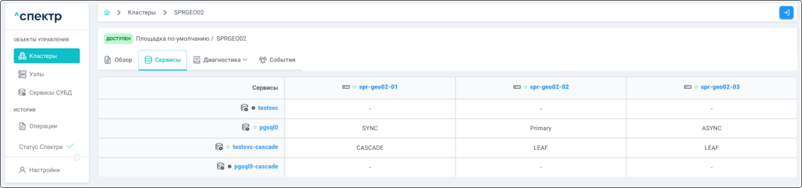 | Кластер | Объект управления верхнего уровня; группа узлов, на которой запускаются сервисы СУБД. Для обеспечения отказоустойчивости сервисов СУБД используется инструмент Pacemaker/Corosync. |