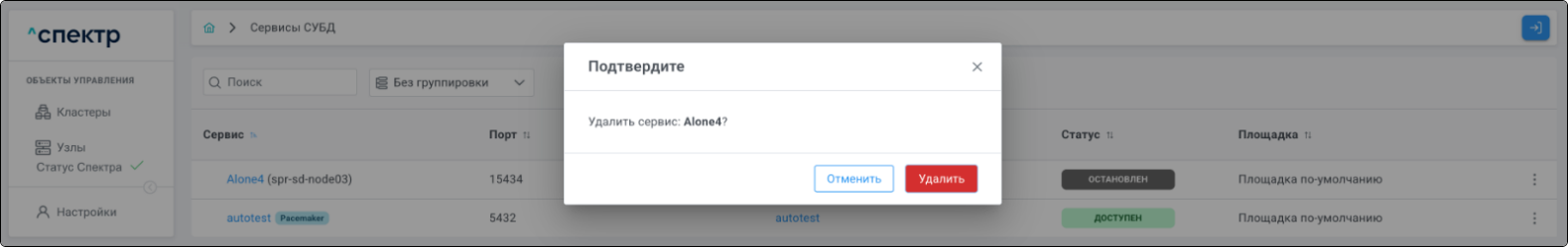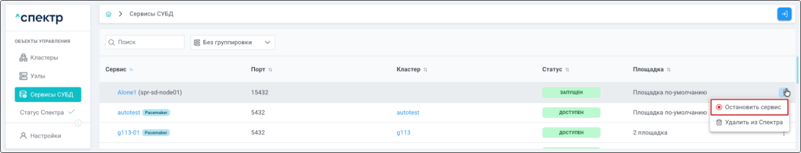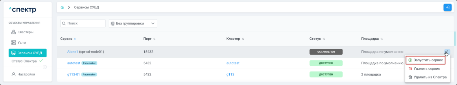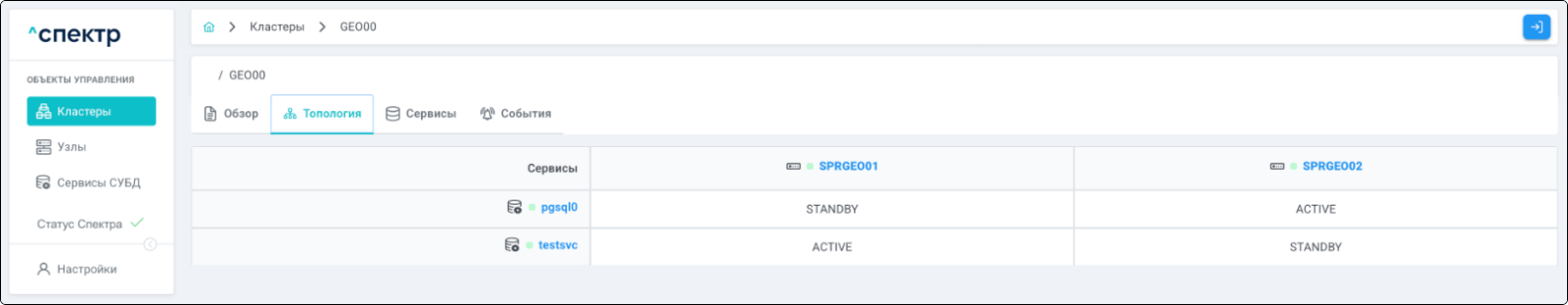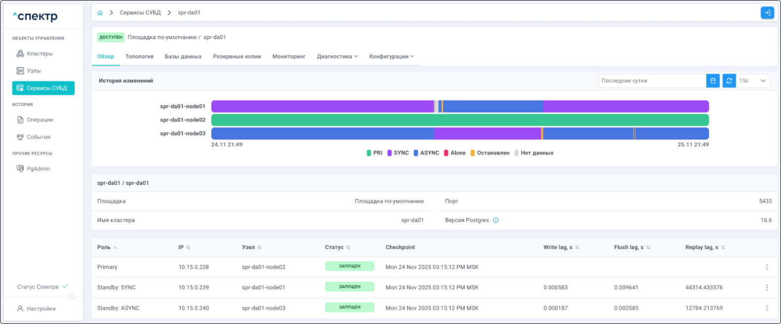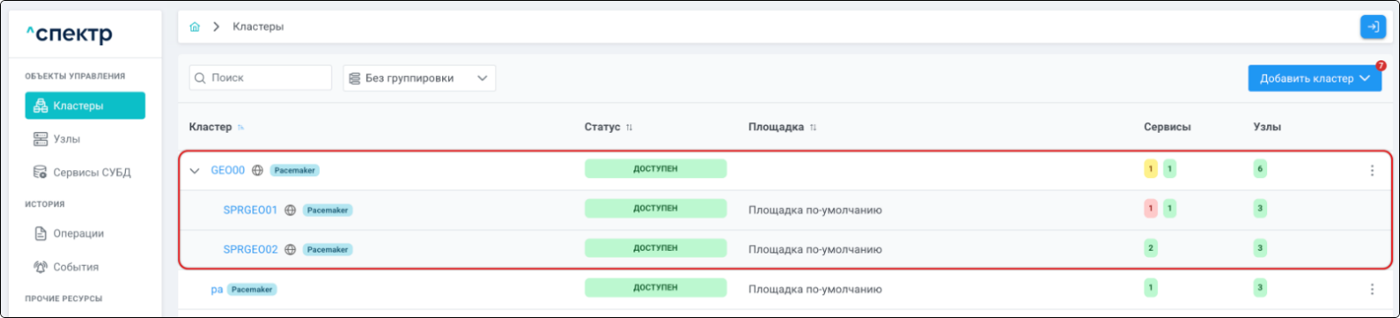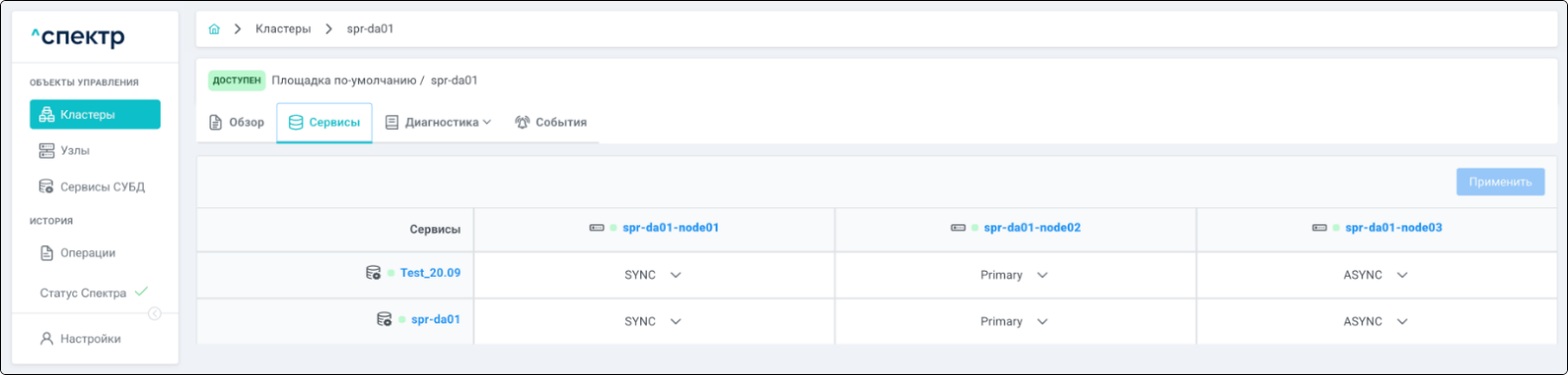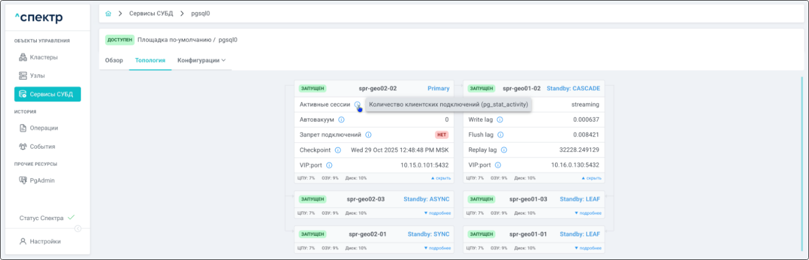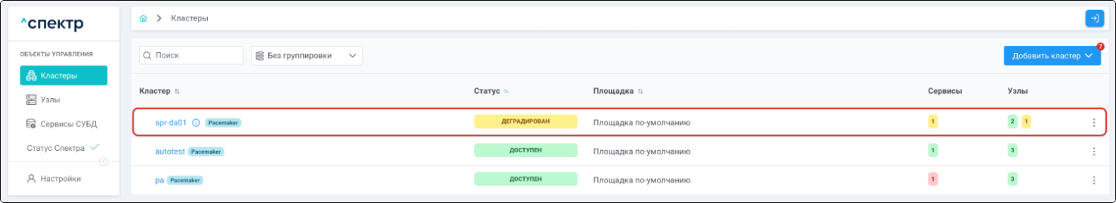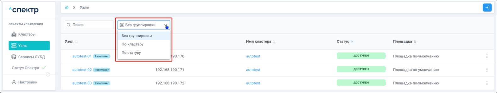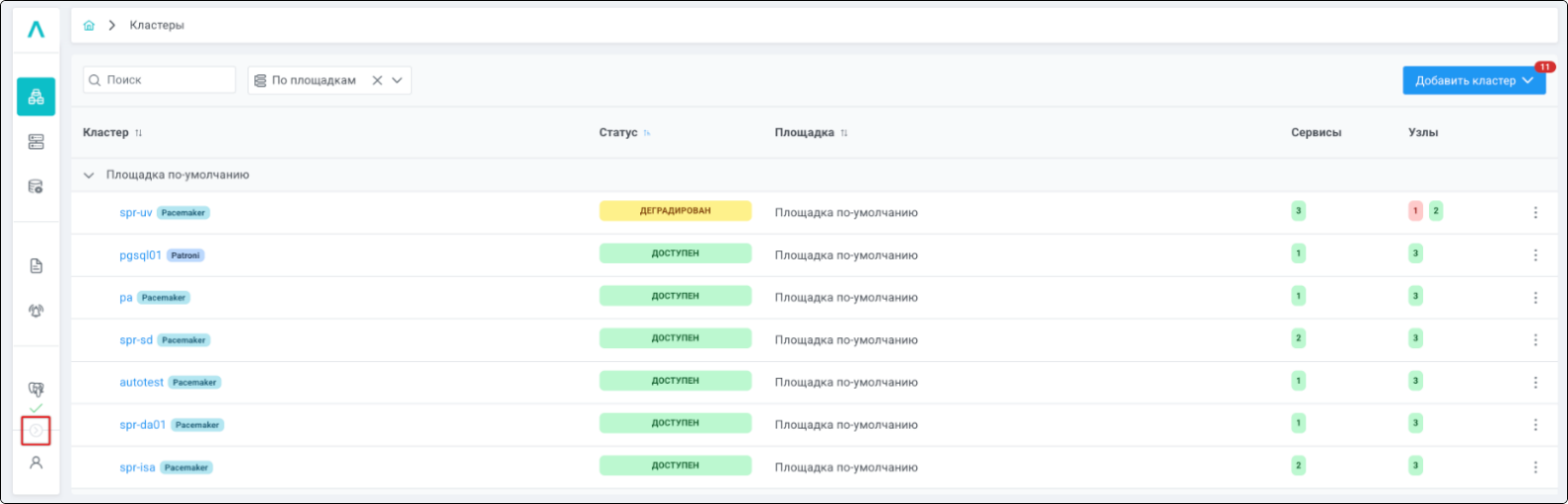 | Кластер | Объект управления верхнего уровня; группа узлов, на которой запускаются сервисы СУБД. Для обеспечения отказоустойчивости сервисов СУБД используется инструмент Pacemaker/Corosync. |