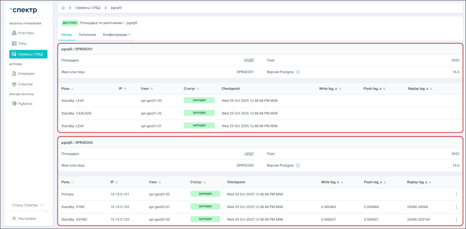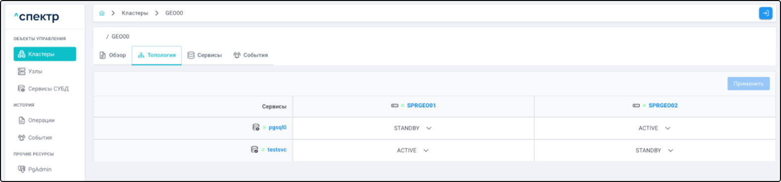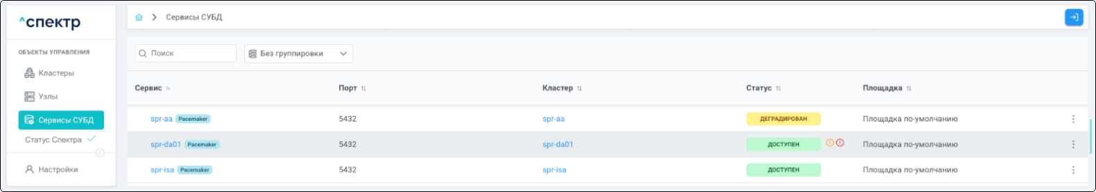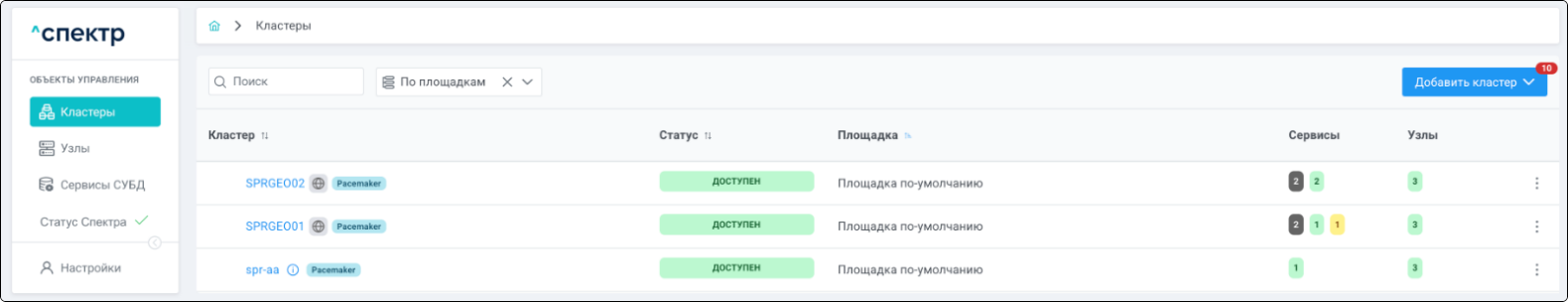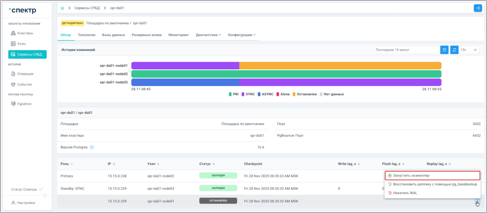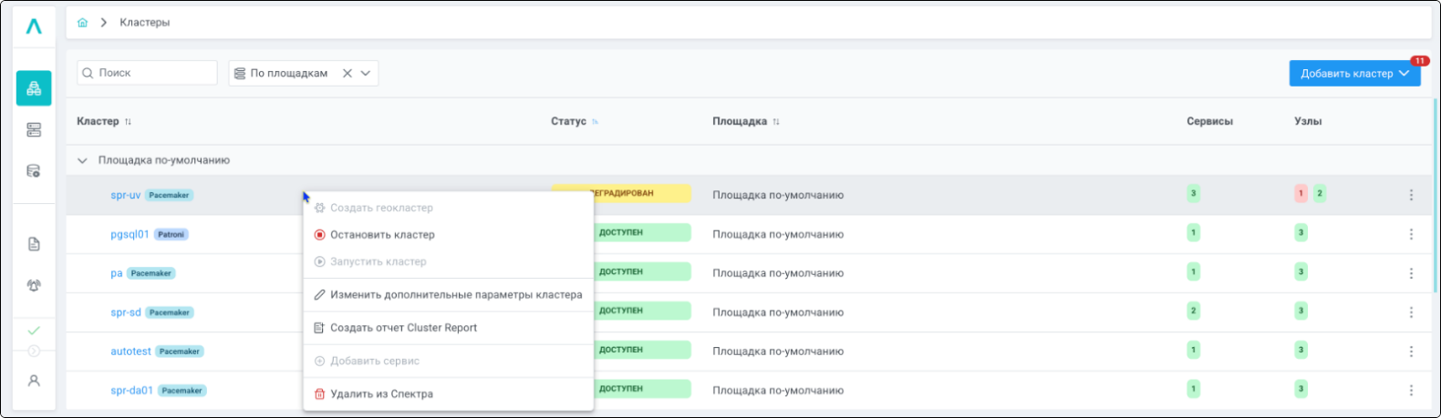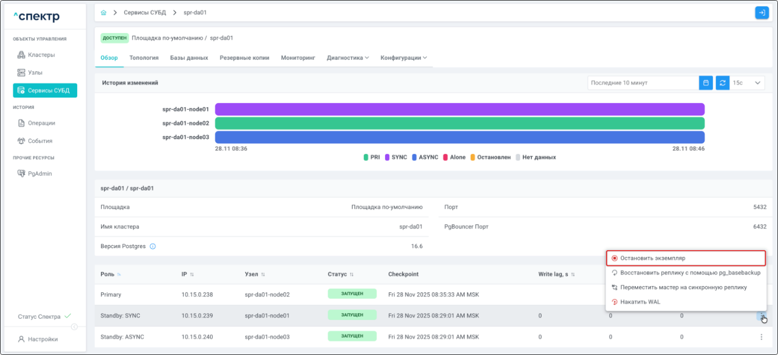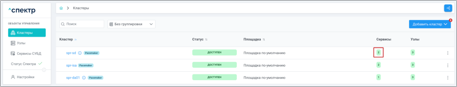 | Кластер | Объект управления верхнего уровня; группа узлов, на которой запускаются сервисы СУБД. Для обеспечения отказоустойчивости сервисов СУБД используется инструмент Pacemaker/Corosync. |