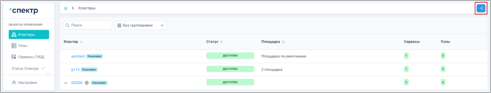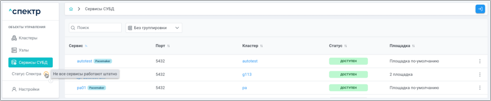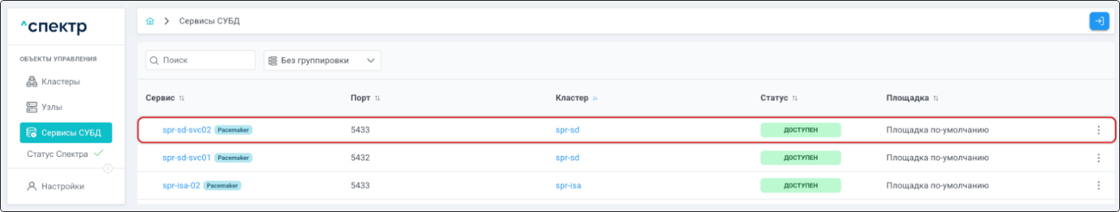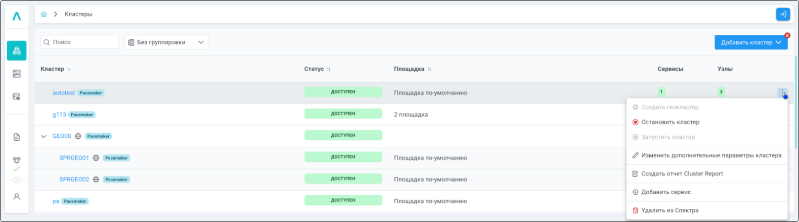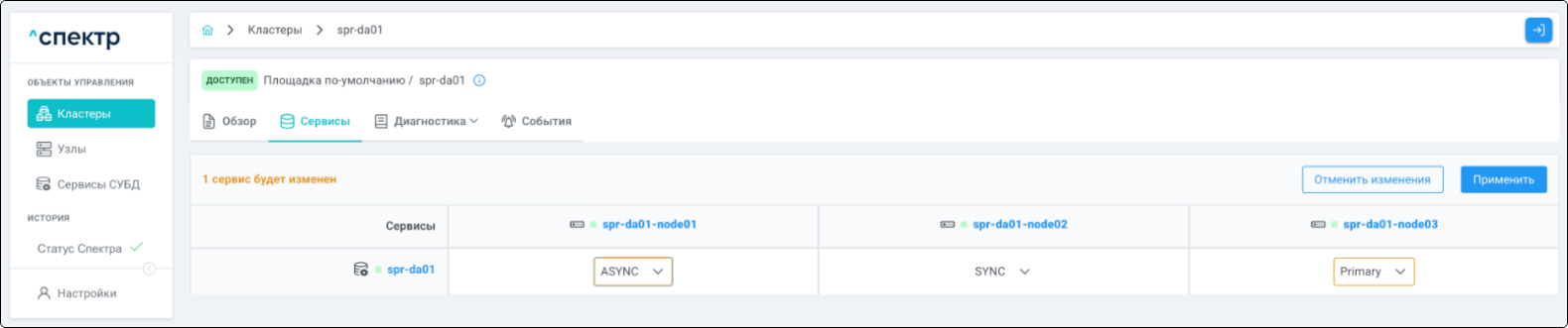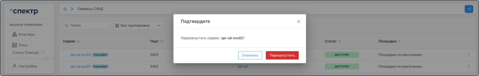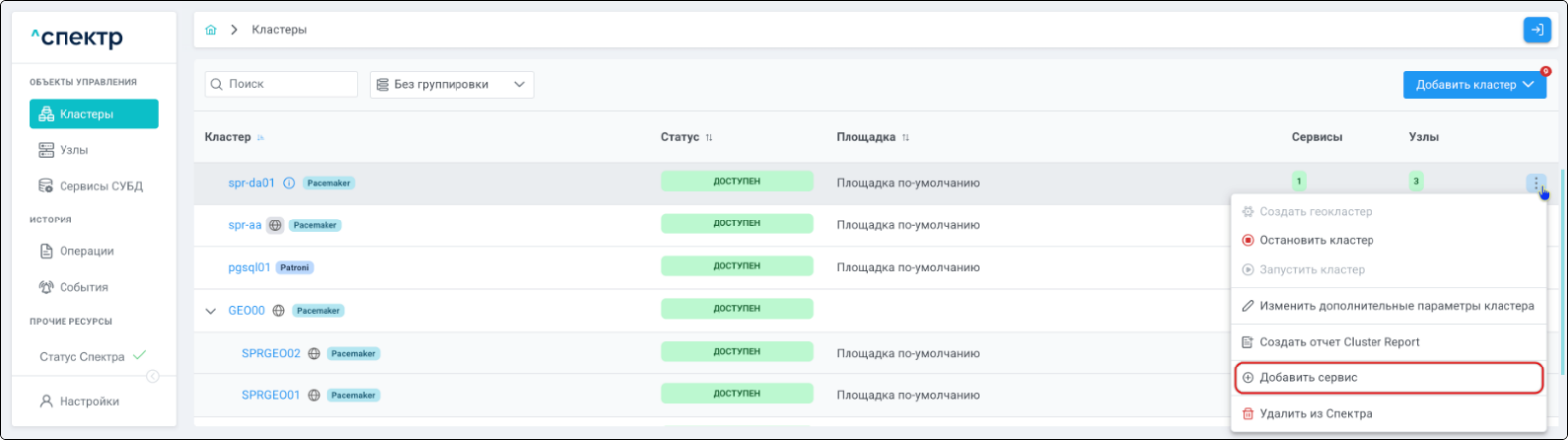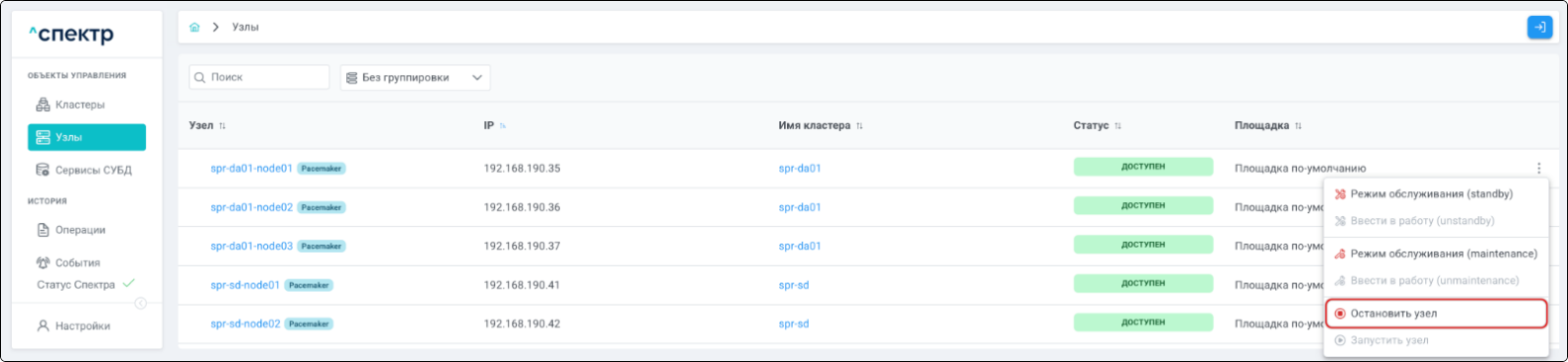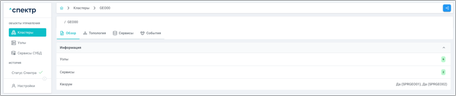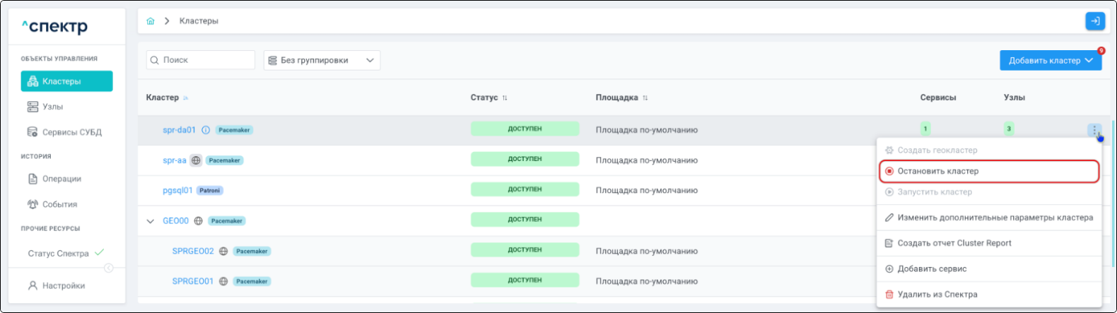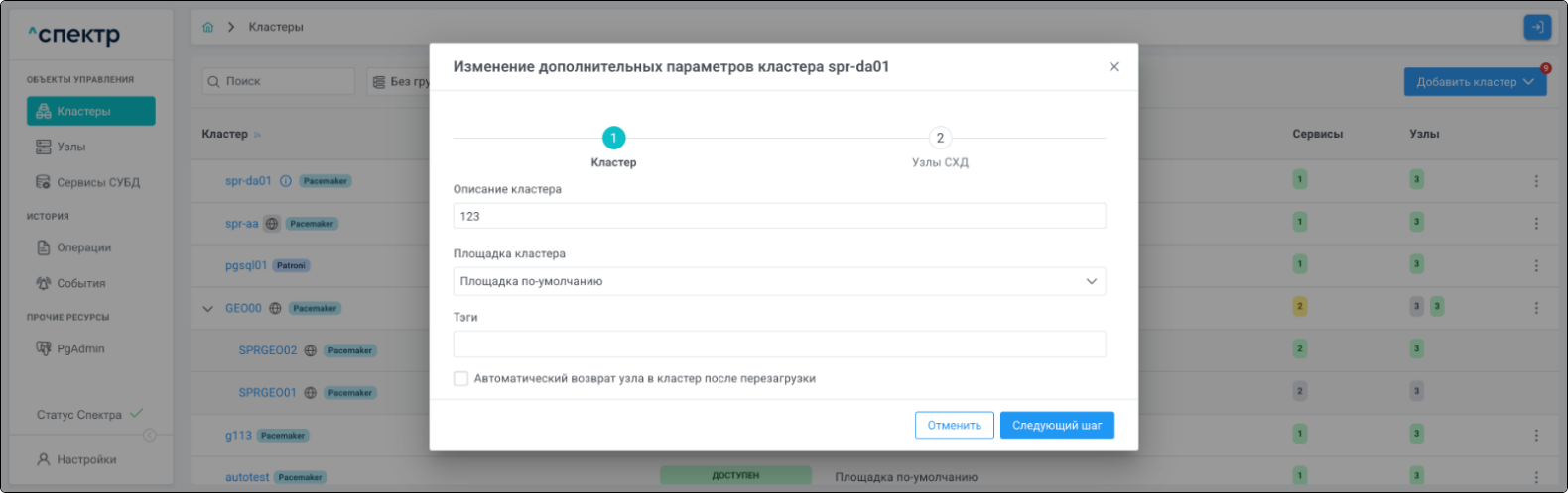 | Кластер | Объект управления верхнего уровня; группа узлов, на которой запускаются сервисы СУБД. Для обеспечения отказоустойчивости сервисов СУБД используется инструмент Pacemaker/Corosync. |