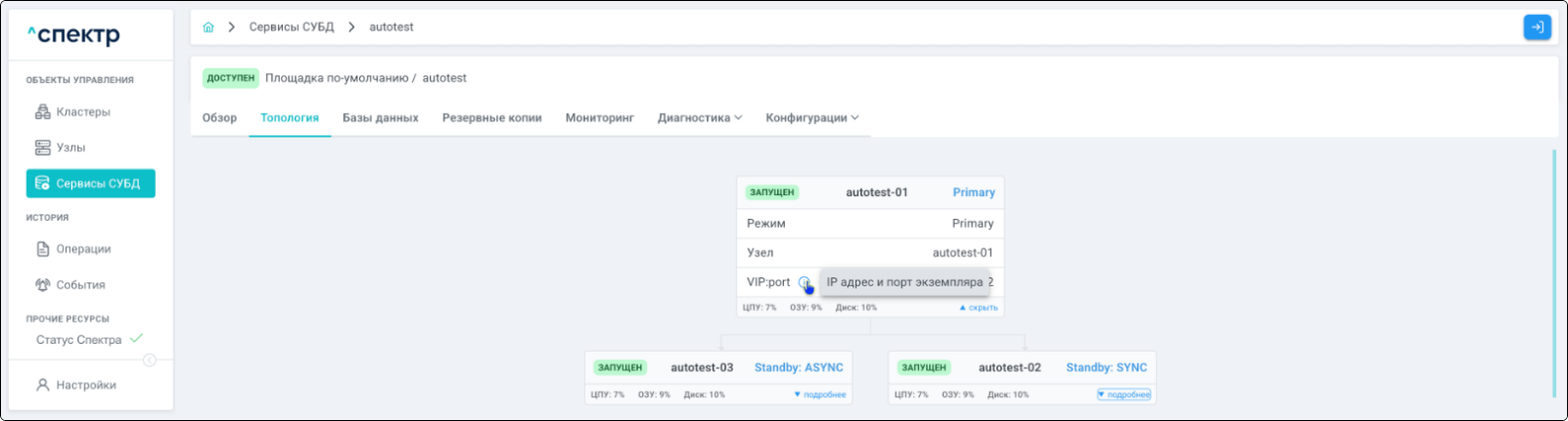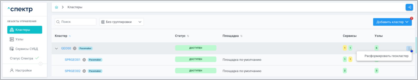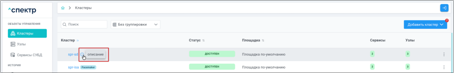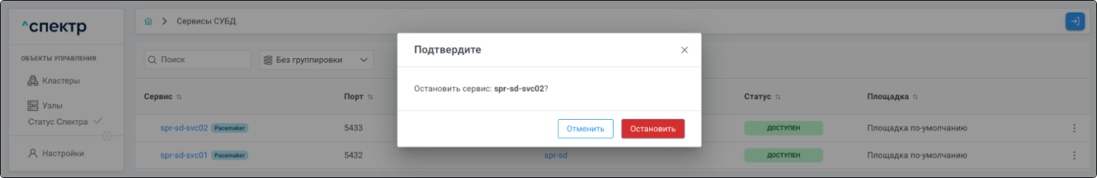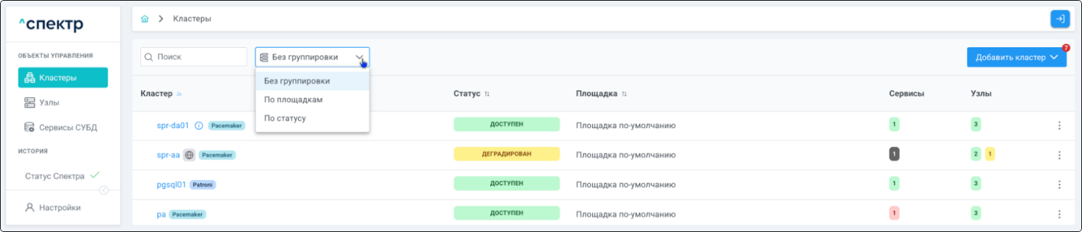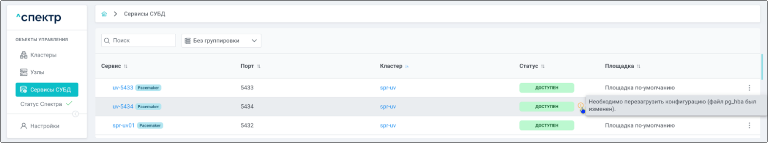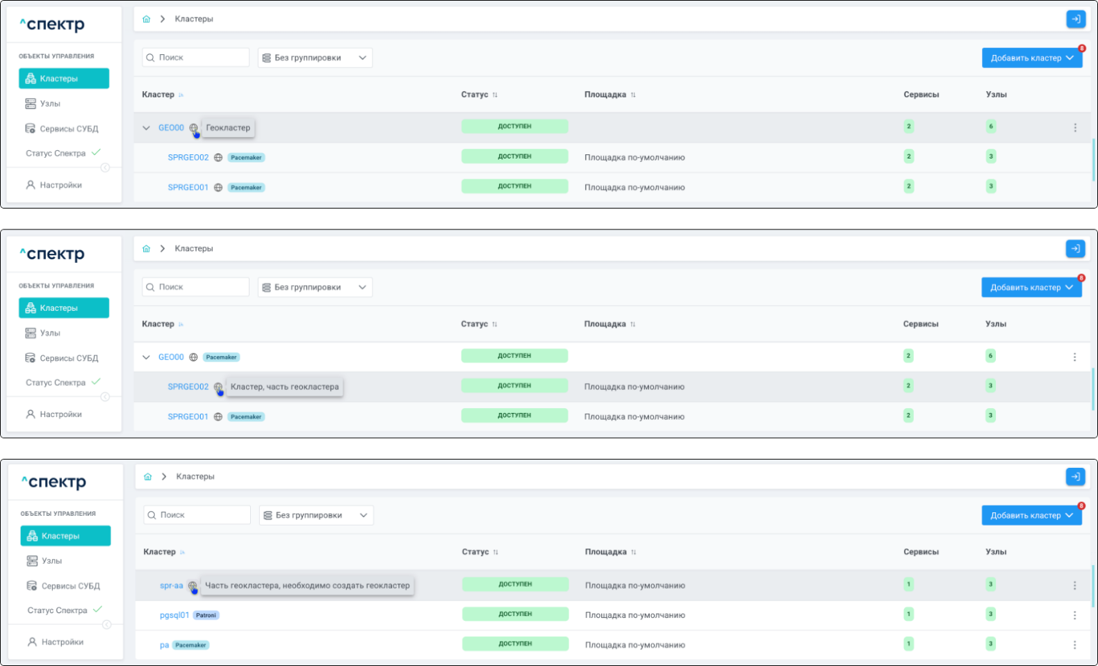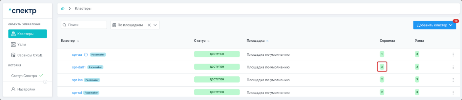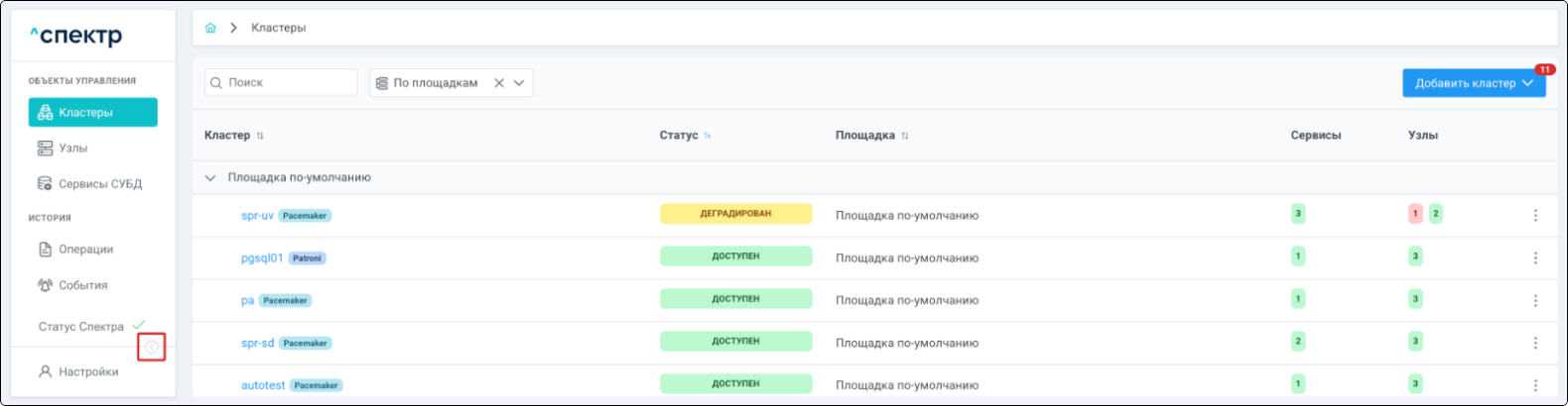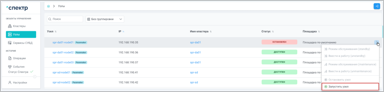 | Кластер | Объект управления верхнего уровня; группа узлов, на которой запускаются сервисы СУБД. Для обеспечения отказоустойчивости сервисов СУБД используется инструмент Pacemaker/Corosync. |