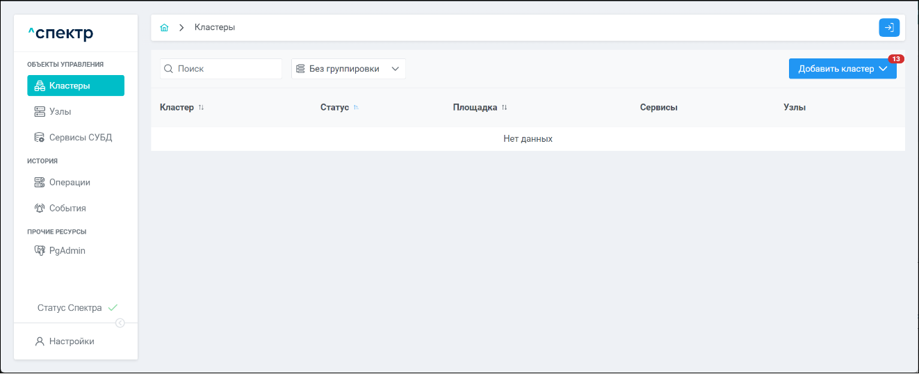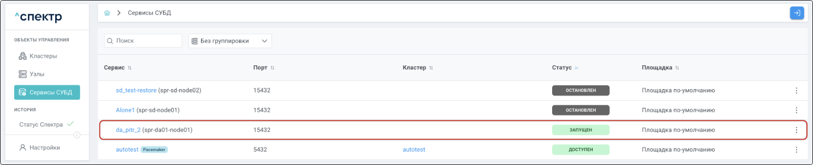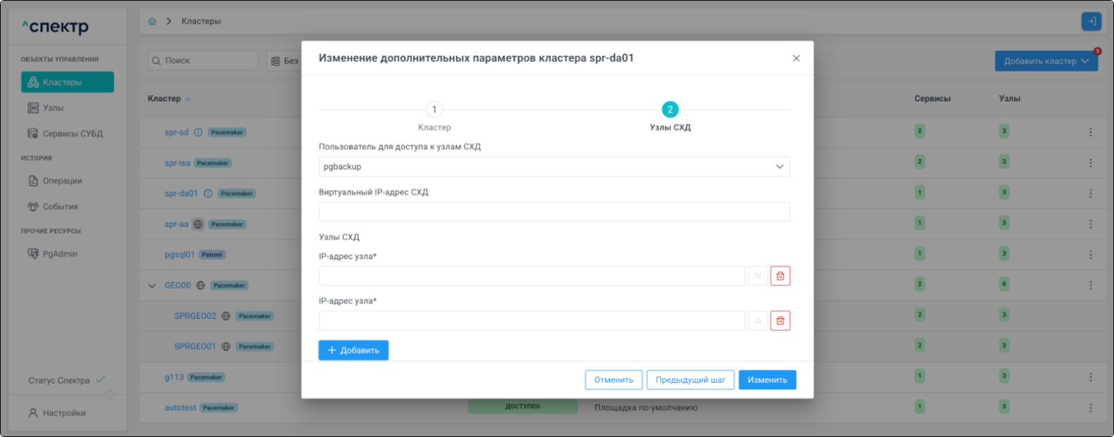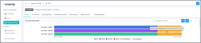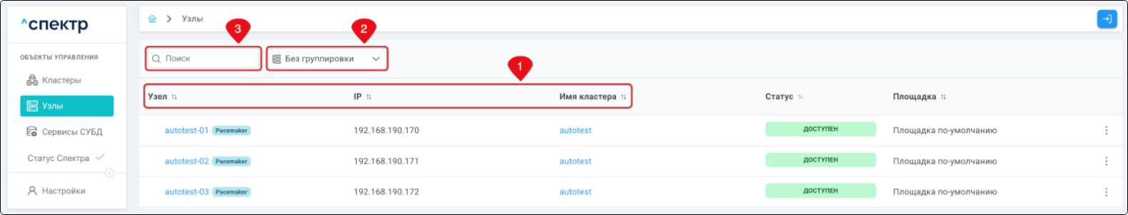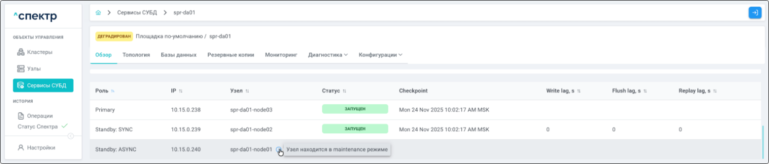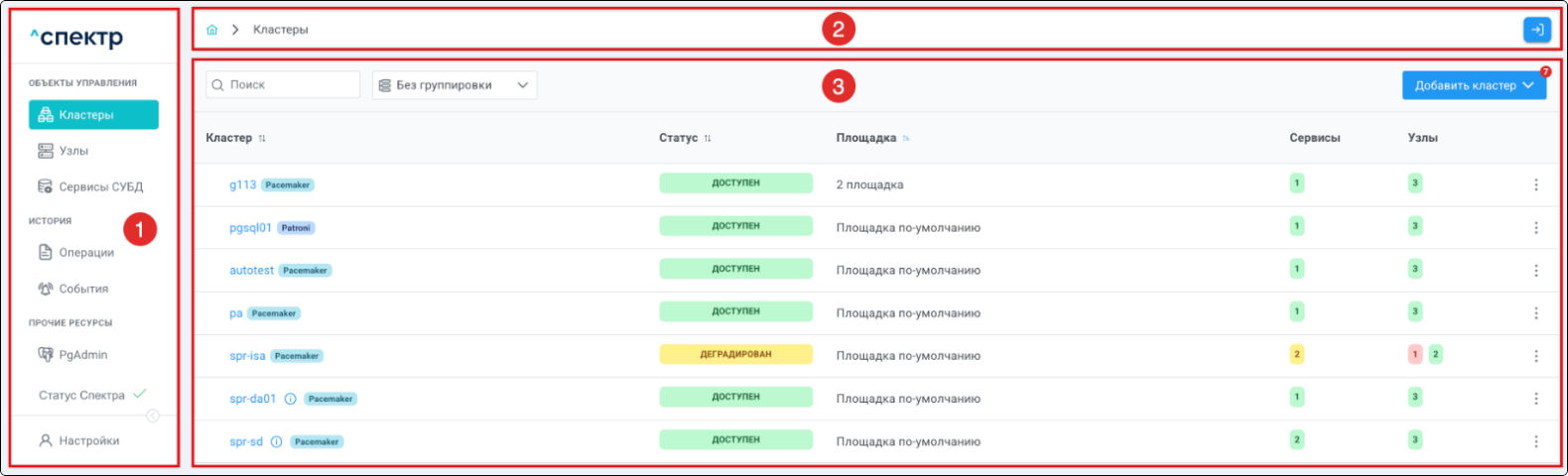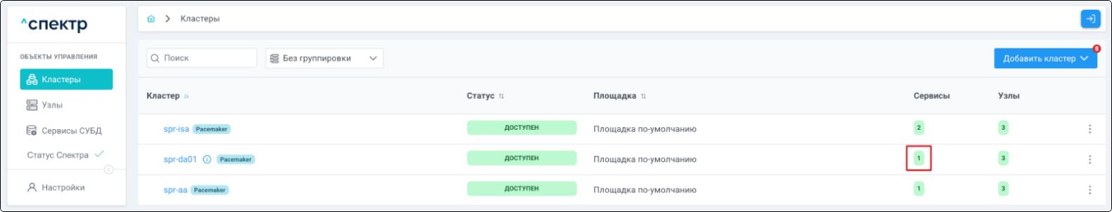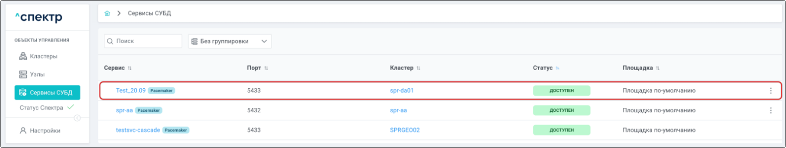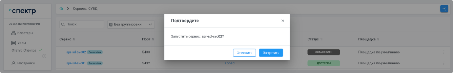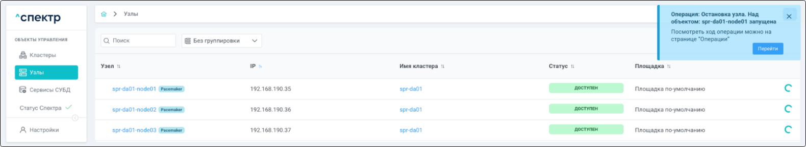 | Кластер | Объект управления верхнего уровня; группа узлов, на которой запускаются сервисы СУБД. Для обеспечения отказоустойчивости сервисов СУБД используется инструмент Pacemaker/Corosync. |