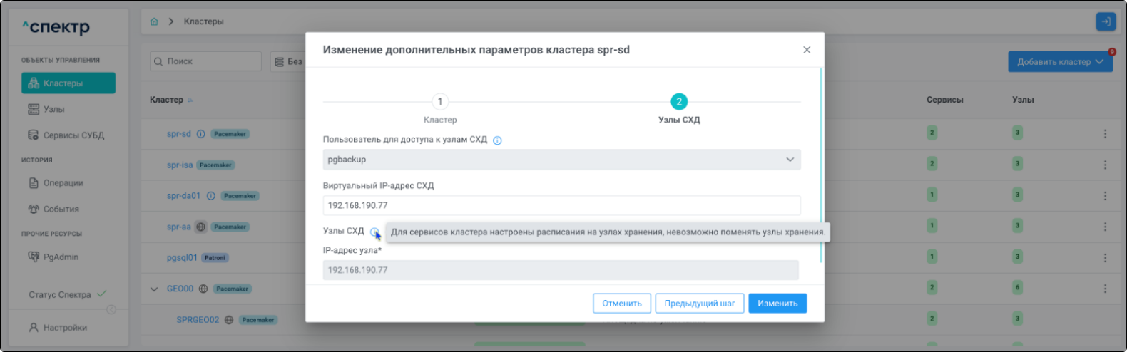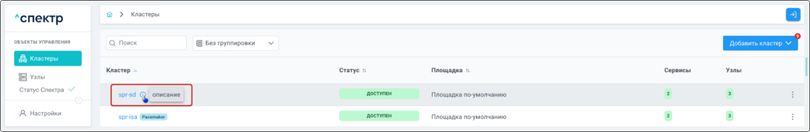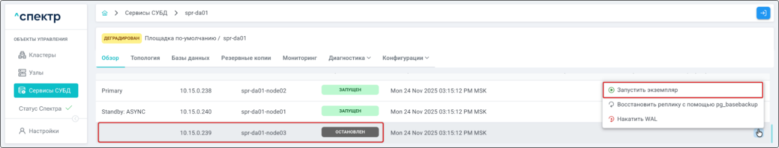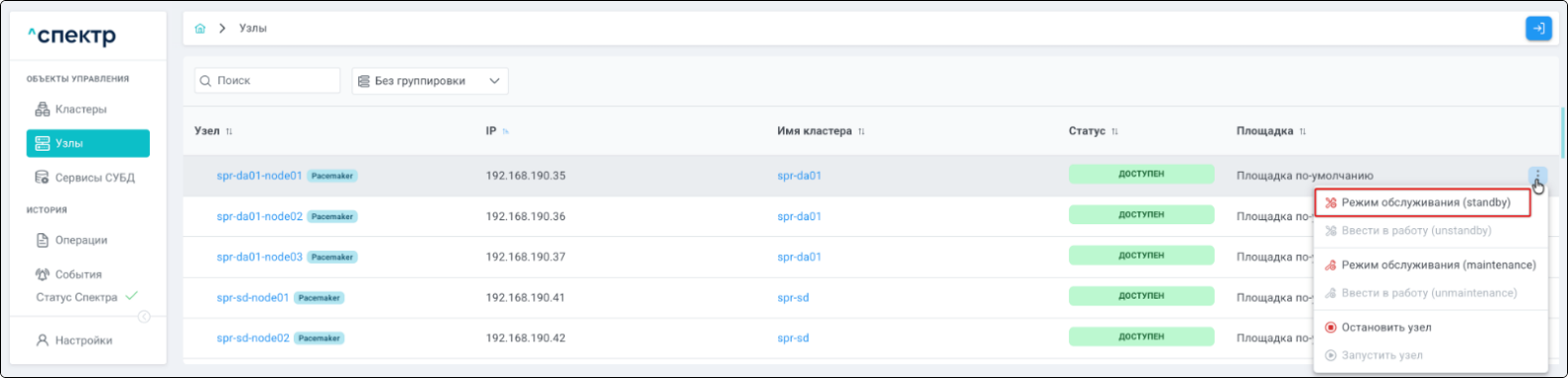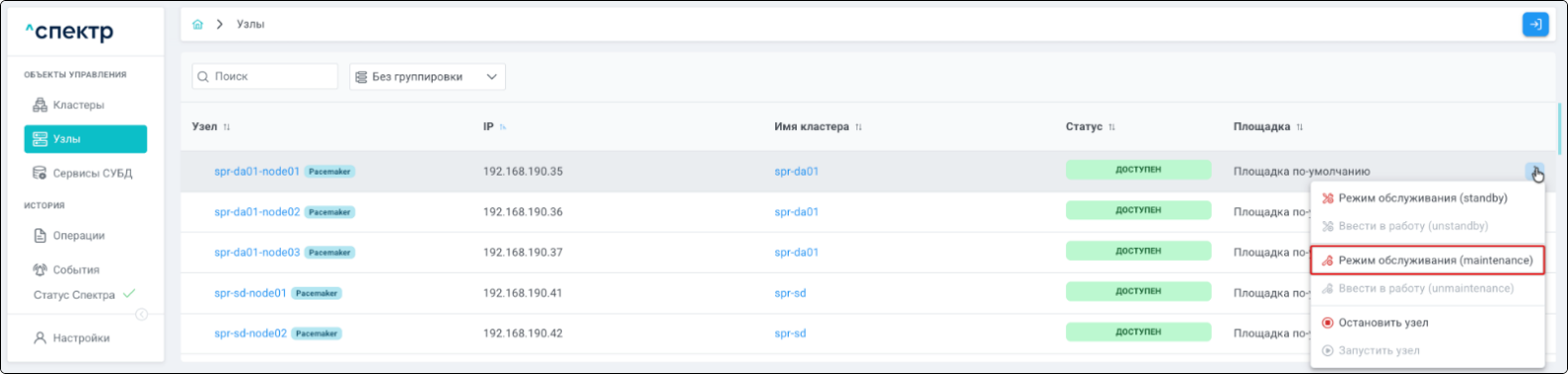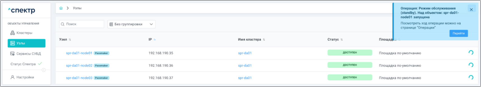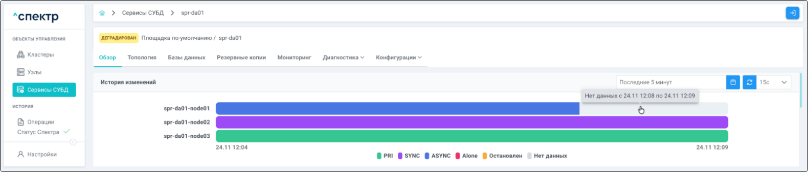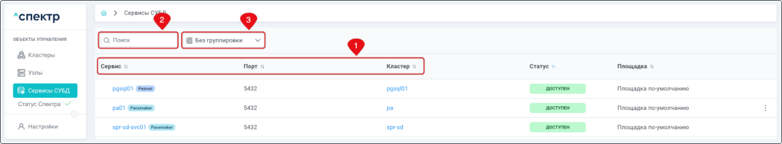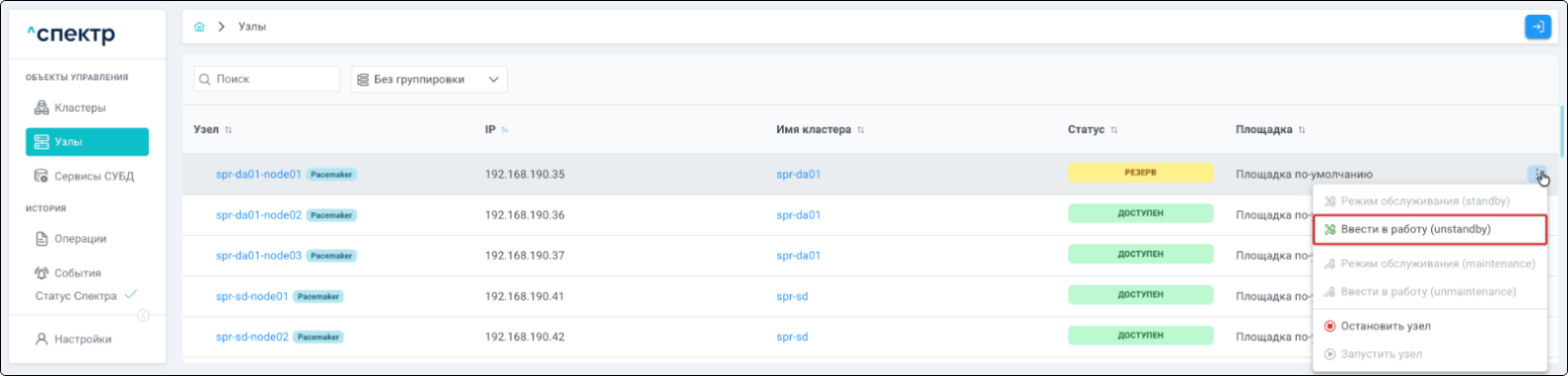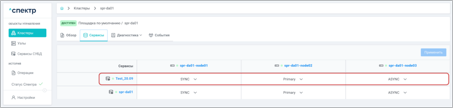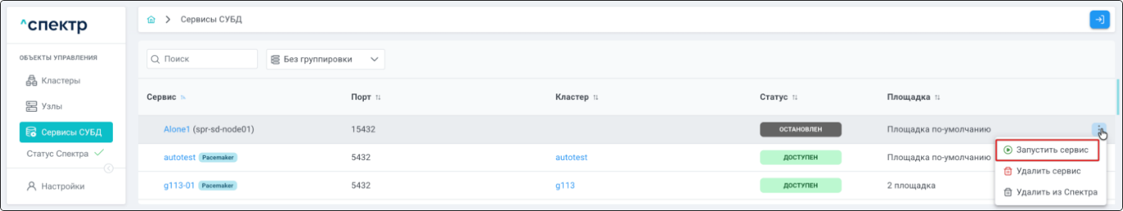 | Кластер | Объект управления верхнего уровня; группа узлов, на которой запускаются сервисы СУБД. Для обеспечения отказоустойчивости сервисов СУБД используется инструмент Pacemaker/Corosync. |
