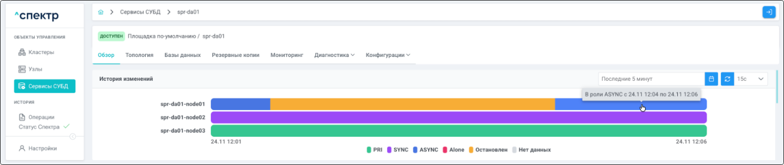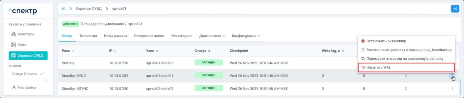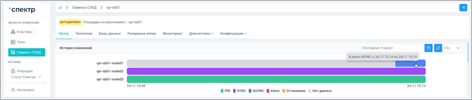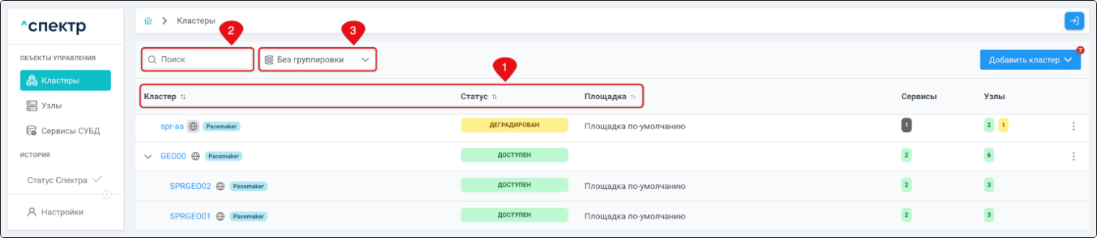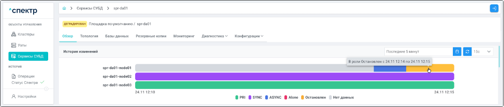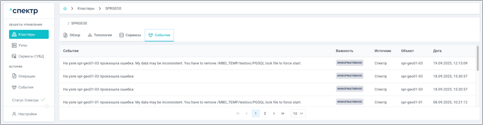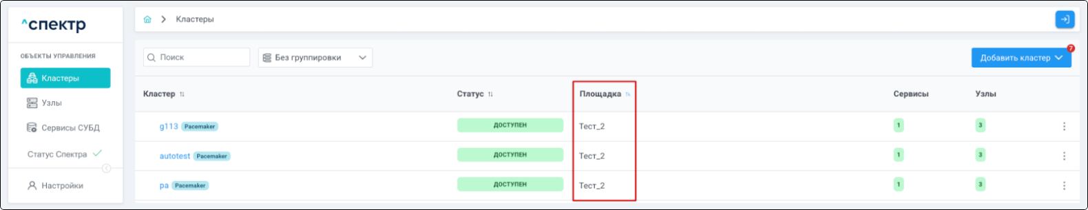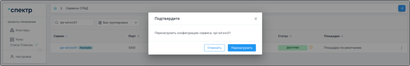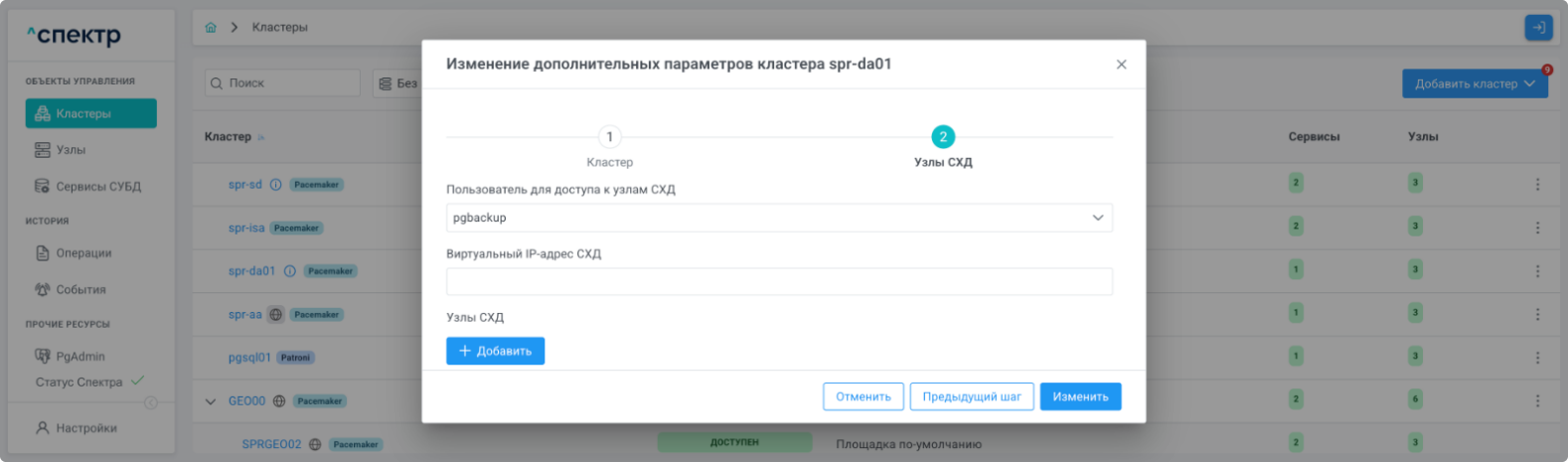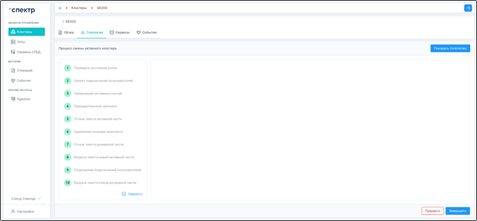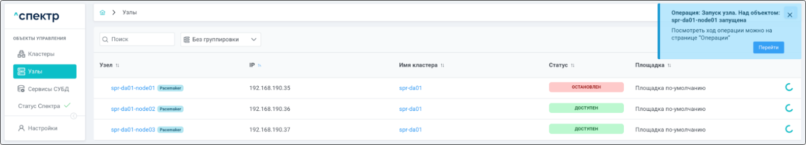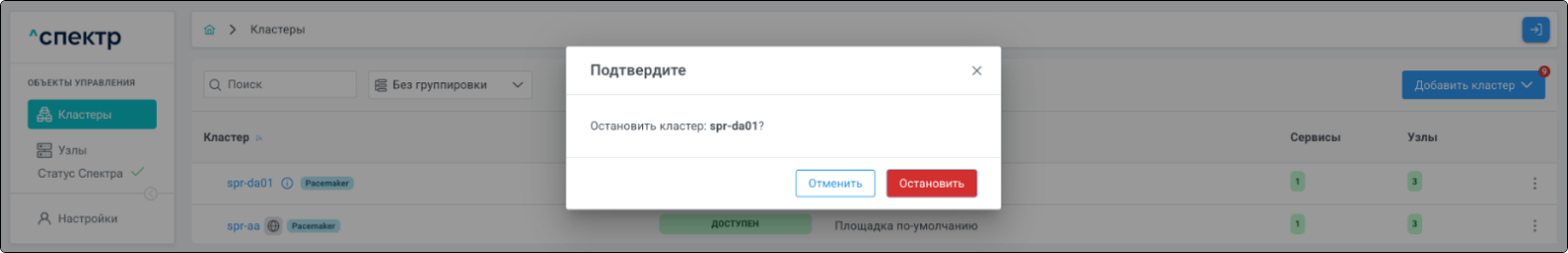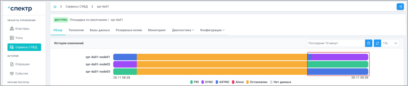 | Кластер | Объект управления верхнего уровня; группа узлов, на которой запускаются сервисы СУБД. Для обеспечения отказоустойчивости сервисов СУБД используется инструмент Pacemaker/Corosync. |