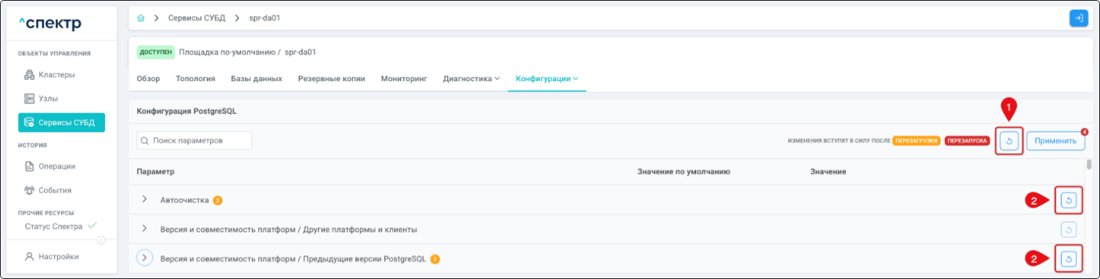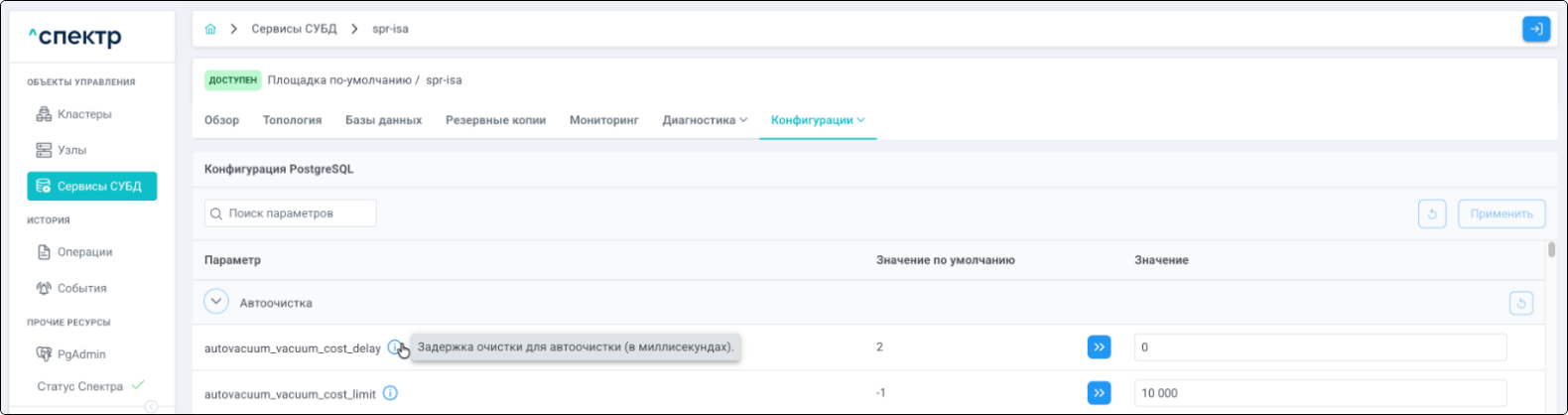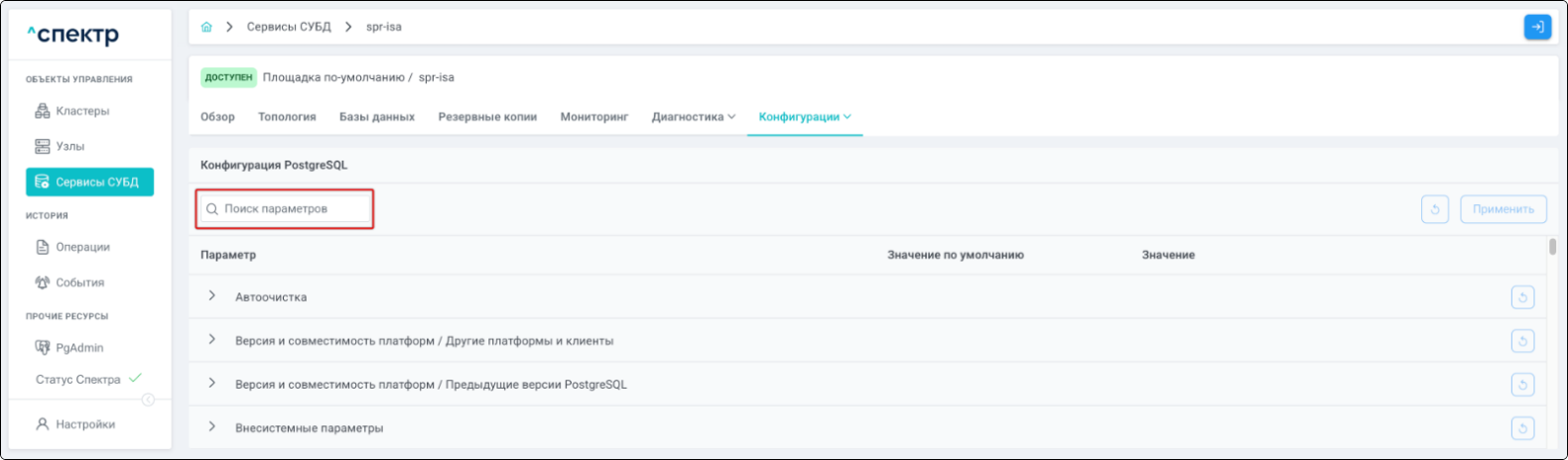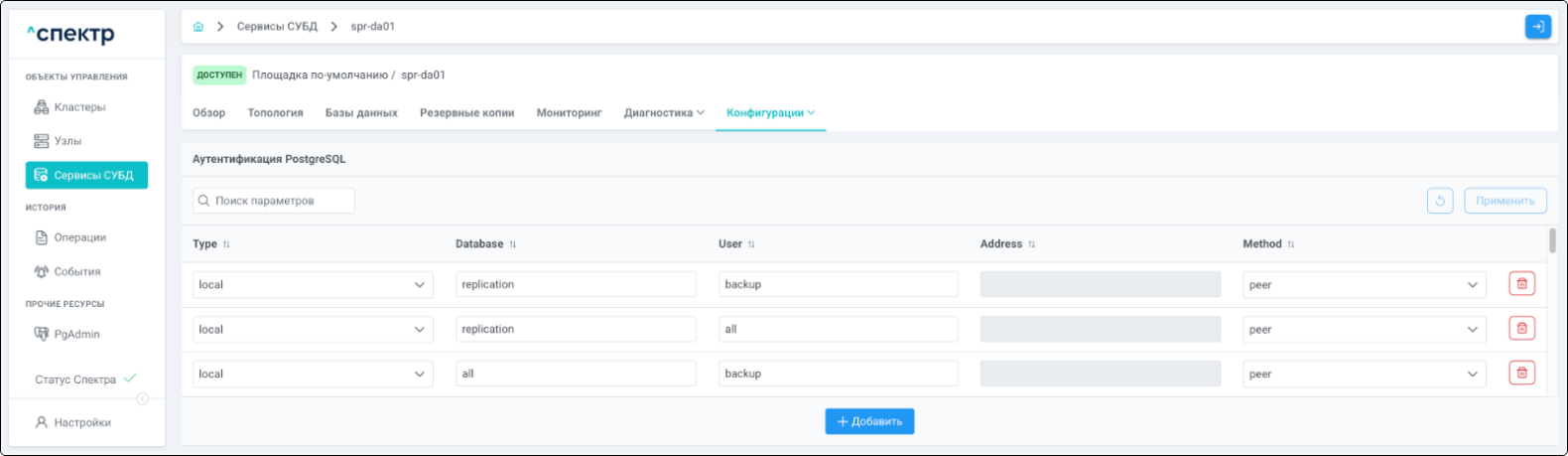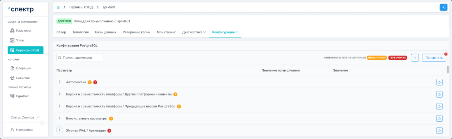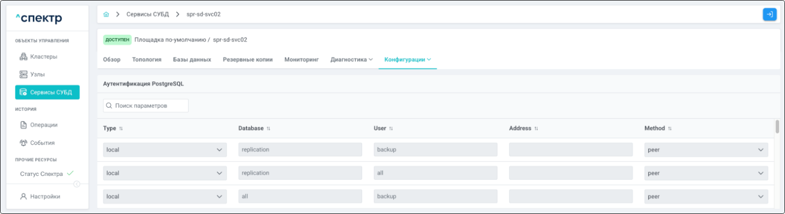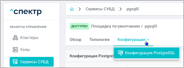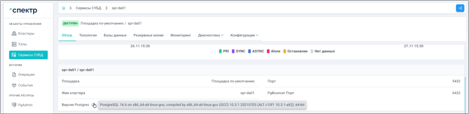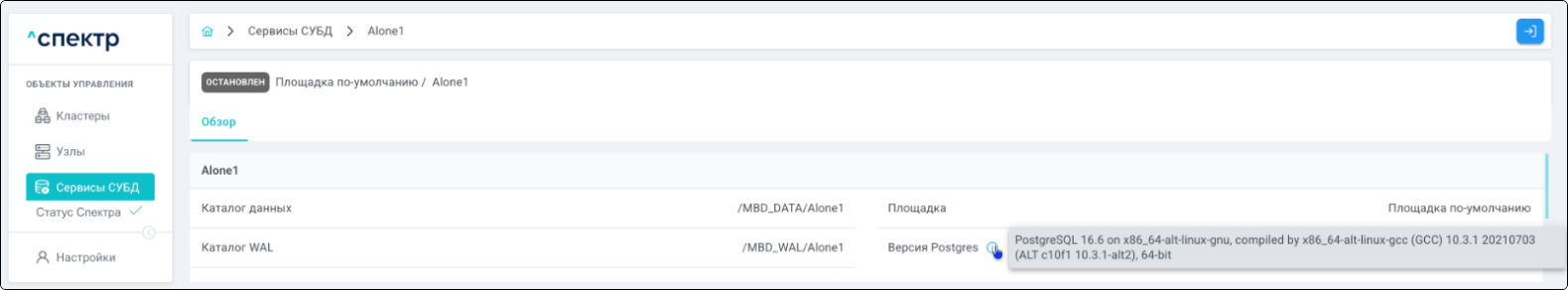 | Экземпляр сервиса СУБД | Работающий на конкретном узле набор процессов PostgreSQL определённой версии. Всегда принадлежит одному сервису СУБД. На узле могут работать несколько экземпляров СУБД, для этого могут использоваться техники изоляции между ними (например, контрольные группы). |