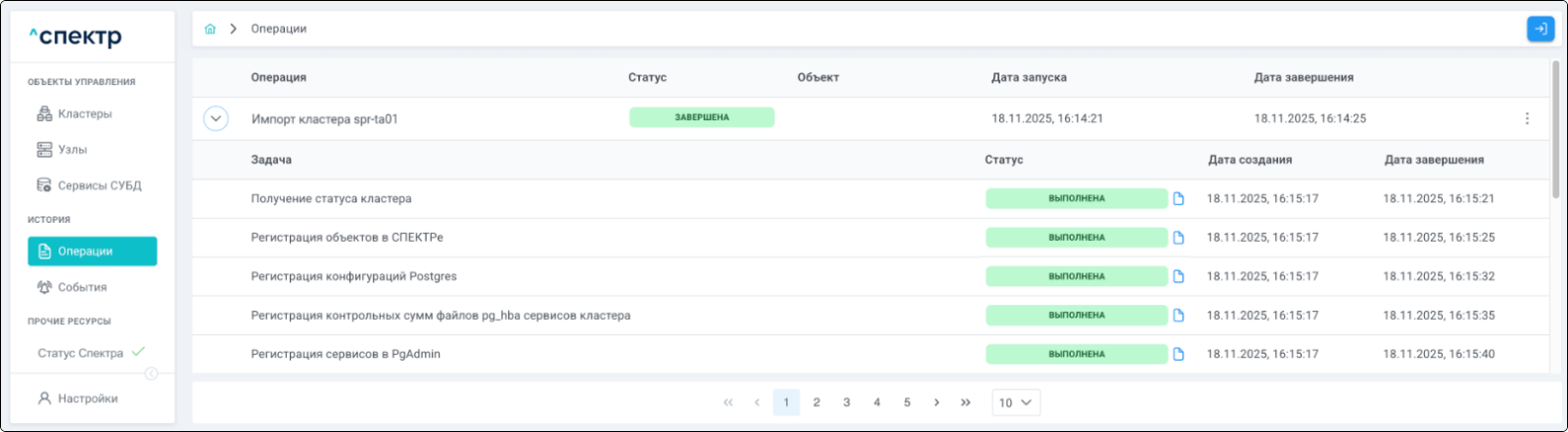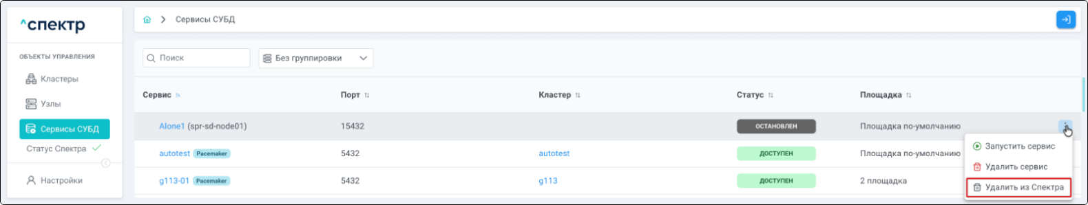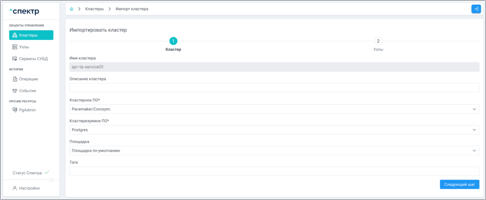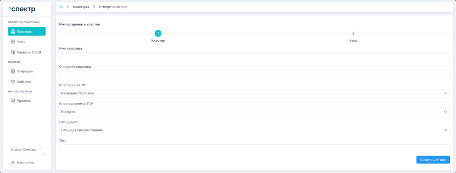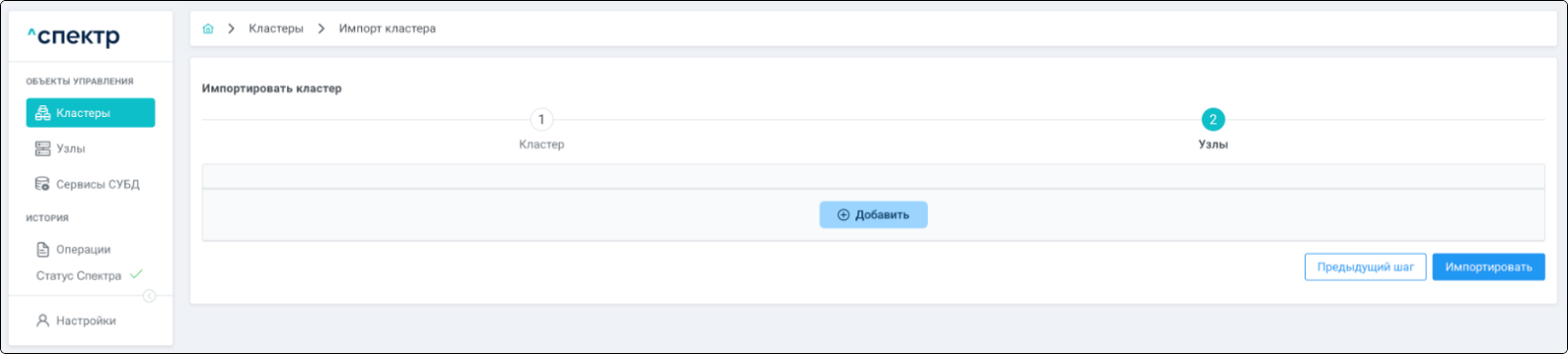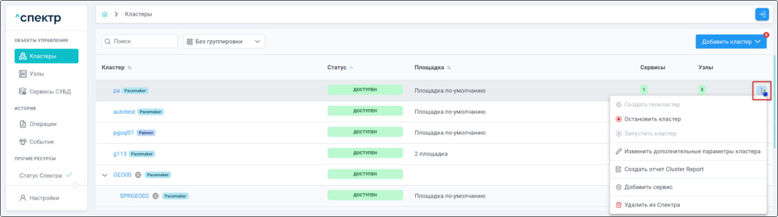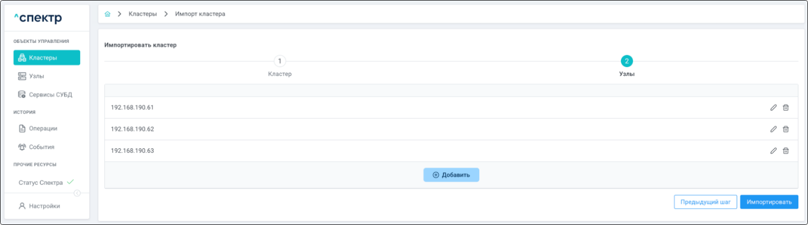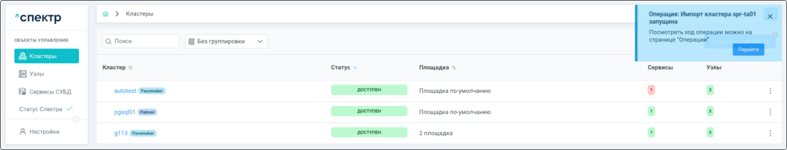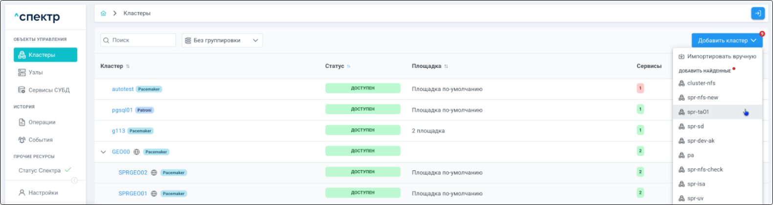 Для кластеров Patroni доступны операции импорта и удаления из Спектра.