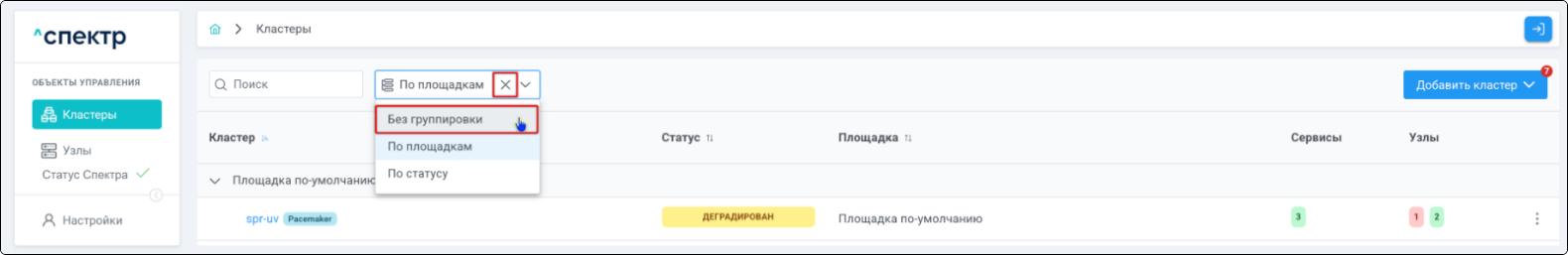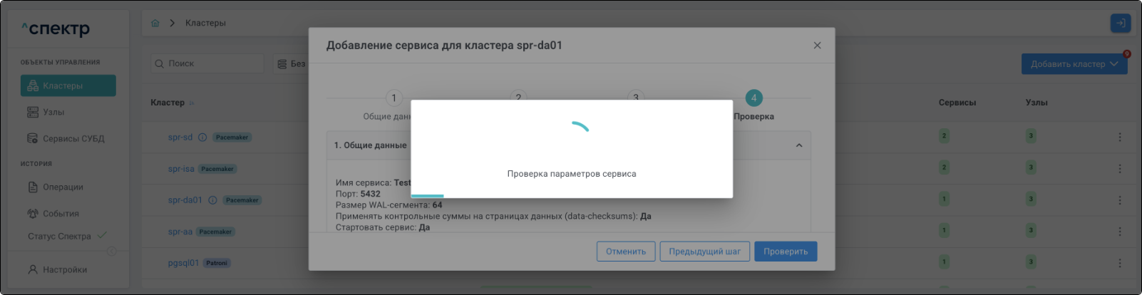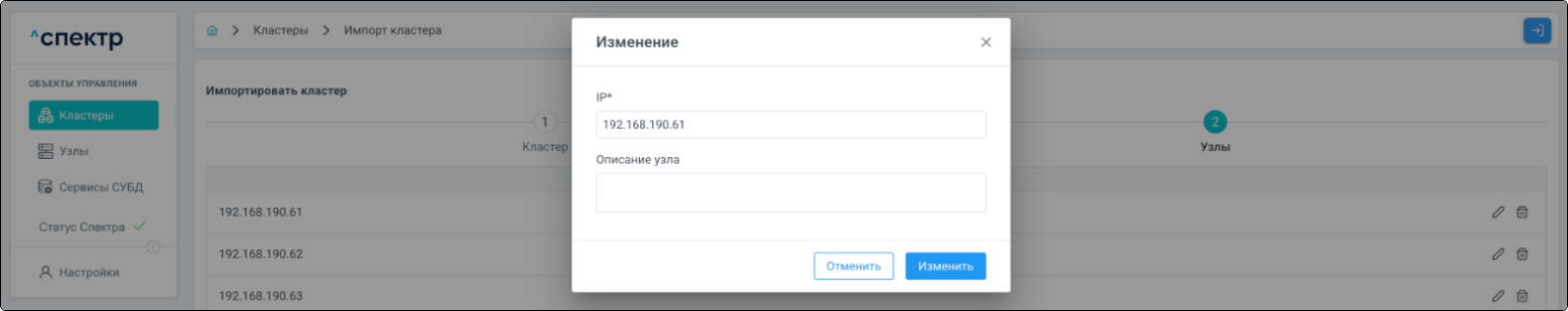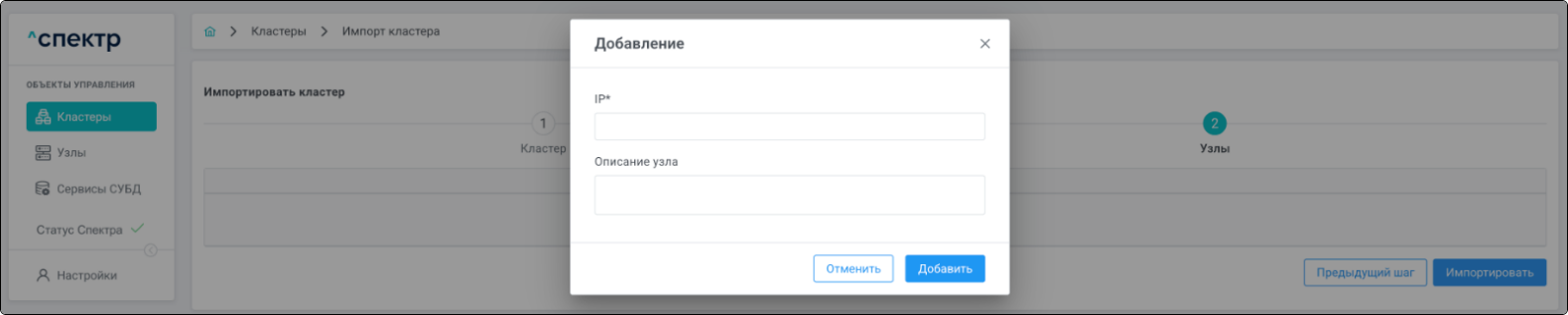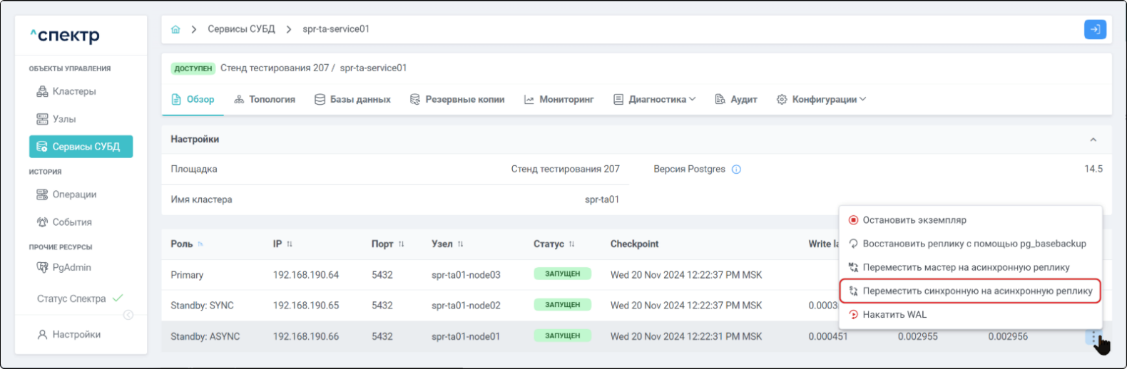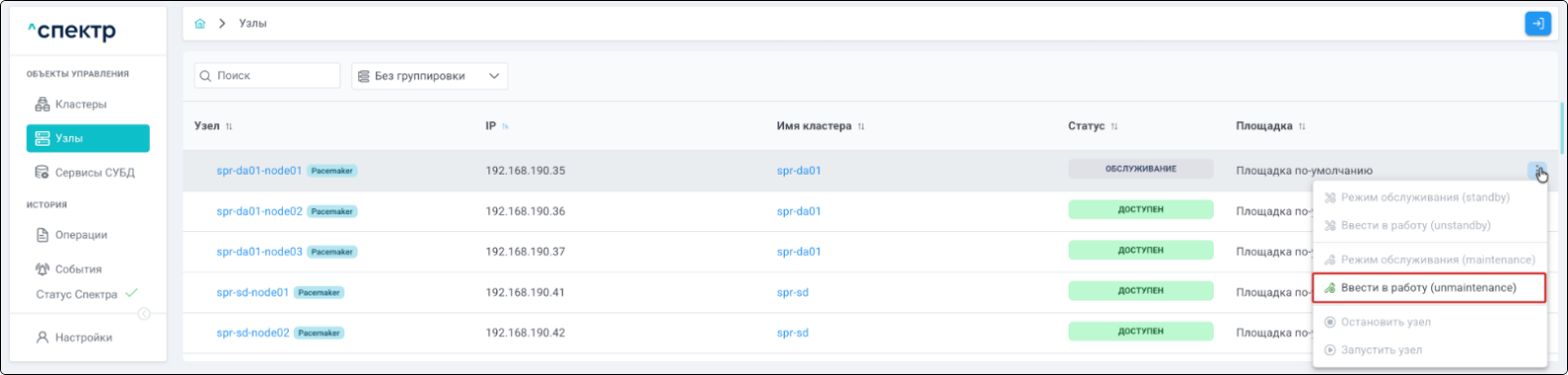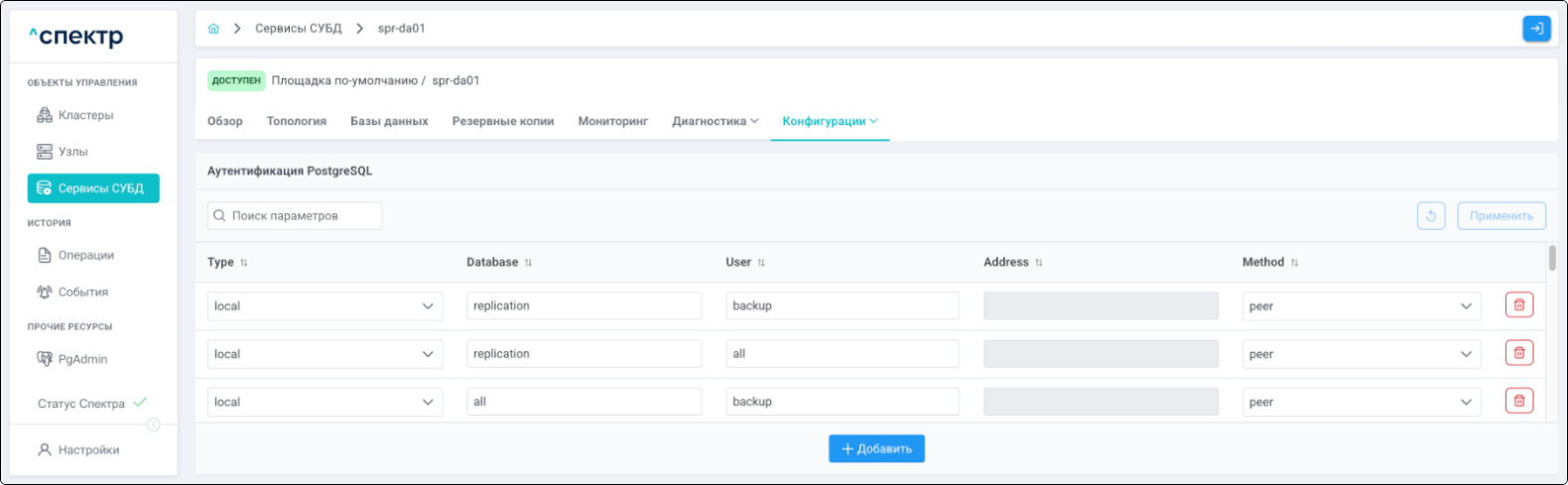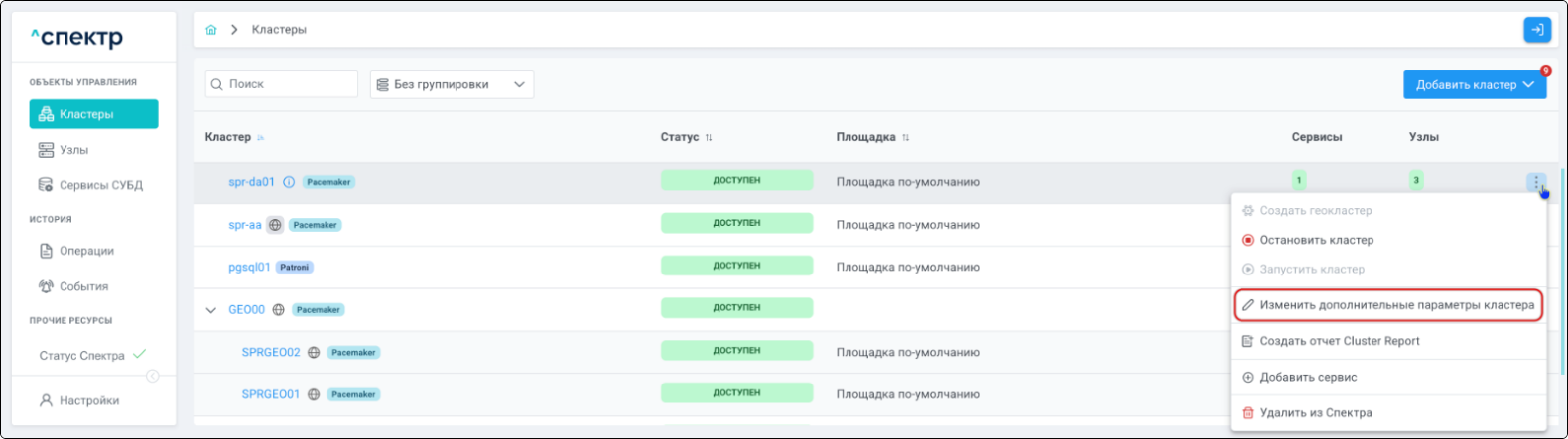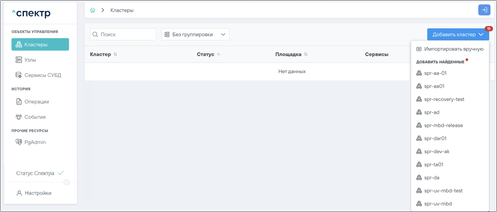 Для кластеров Patroni доступны операции импорта и удаления из Спектра.